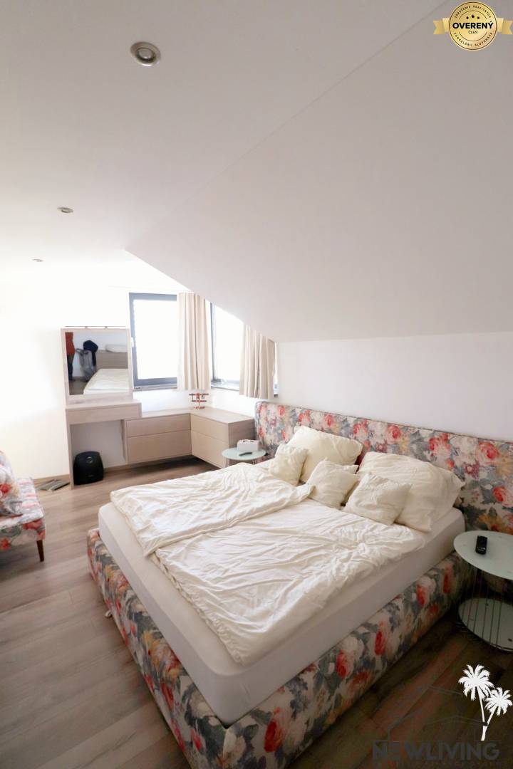 Na poschodí je chodba, na ľavej strane spálňa s vlastnou kúpeľňou a vstupom na terasu, na pravej strane detská izba s výstupom na terasu, detská izba č. 2 tiež s výstupom na terasu, kúpeľňa pre poschodie, odkladací priestor, priestor pre práčku, sušičku a kotol, ako aj výstup na povalu.