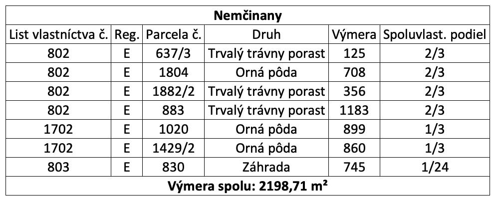 – Výmera predávaných spoluvlastníckych podielov tvorí celkom 2.198,71 m2. Pozemky sú evidované na listoch vlastníctva č. 802 a 1702 pre katastrálne územie Nemčinany, pričom na listoch vlastníctva sú vedené ako Orná pôda, Trvalý trávny porast a Záhrada.