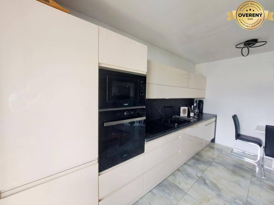 V kuchyni sa nachádza kuchynská linka vyrábaná na mieru so vstavanými spotrebičmi - chladnička s mrazničkou, umývačka riadu, mikrovlná rúra a rúra značky Whirlpool, varná doska značky BORA, ktorá má jednu výbornú funkciu a to je zabudované odsávanie s vývodom von.