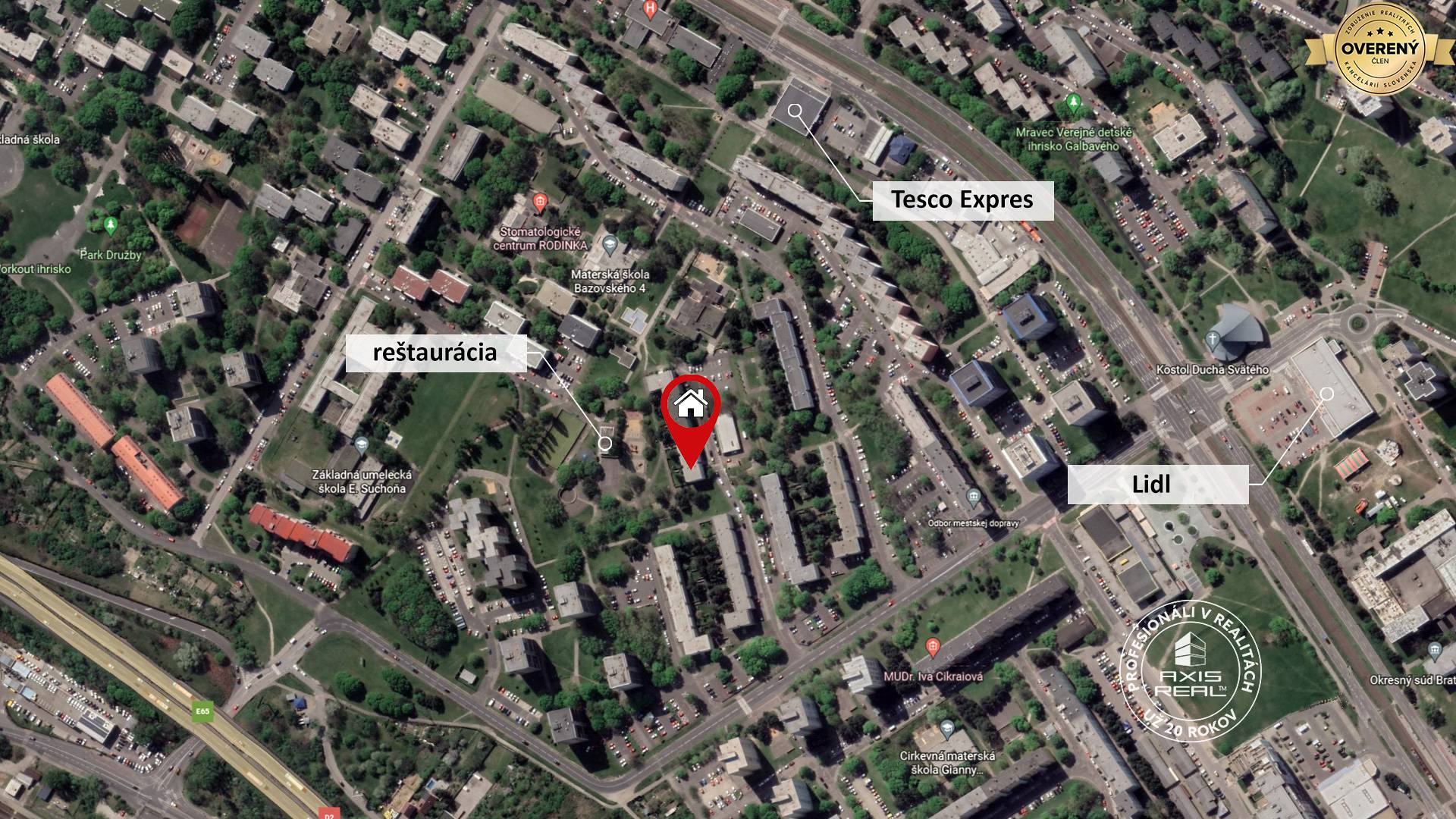 Bytový dom sa nachádza v lokalite PLENEJ PARKOV, ZELENE a detských ihrísk. Priamo pred bytovým domom oddychová zóna s parkom, detským a multifunkčným ihriskom, amfiteáter a reštaurácia. Neďaleko je aj Centrum voľného času Klokan a obľúbený Park Družby. V pešej dostupnosti je kompletná občianska vybavenosť - TESCO EXPRES, lekáreň, reštaurácie, pizzérie, Stomatologické centrum RODINKA, Základná škola Bazovského, Základná umelecká škola E. Suchoňa. Táto lokalita ponúka výbornú dostupnosť aj mestskou hromadnou dopravou: električka č. 4, zastávky autobusov č. 20, 83, 84, N34 a PRAKTICKÉ NAPOJENIE NA DIAĽNIČNÝ OBCHVAT. V centre mesta ste do 15 minút.