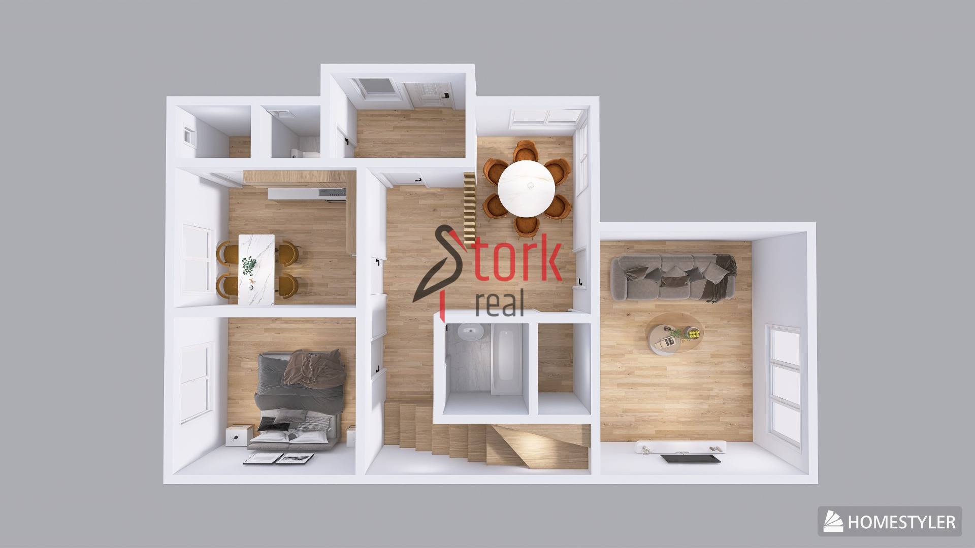 -> Na poschodí sa nachádza chodba, dve samostatné izby (menšia s balkónom do dvora) a priestranný poval.
