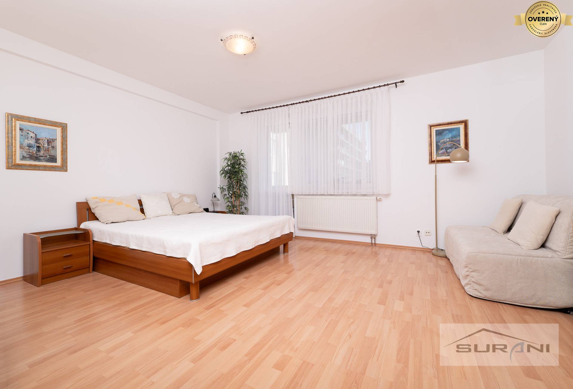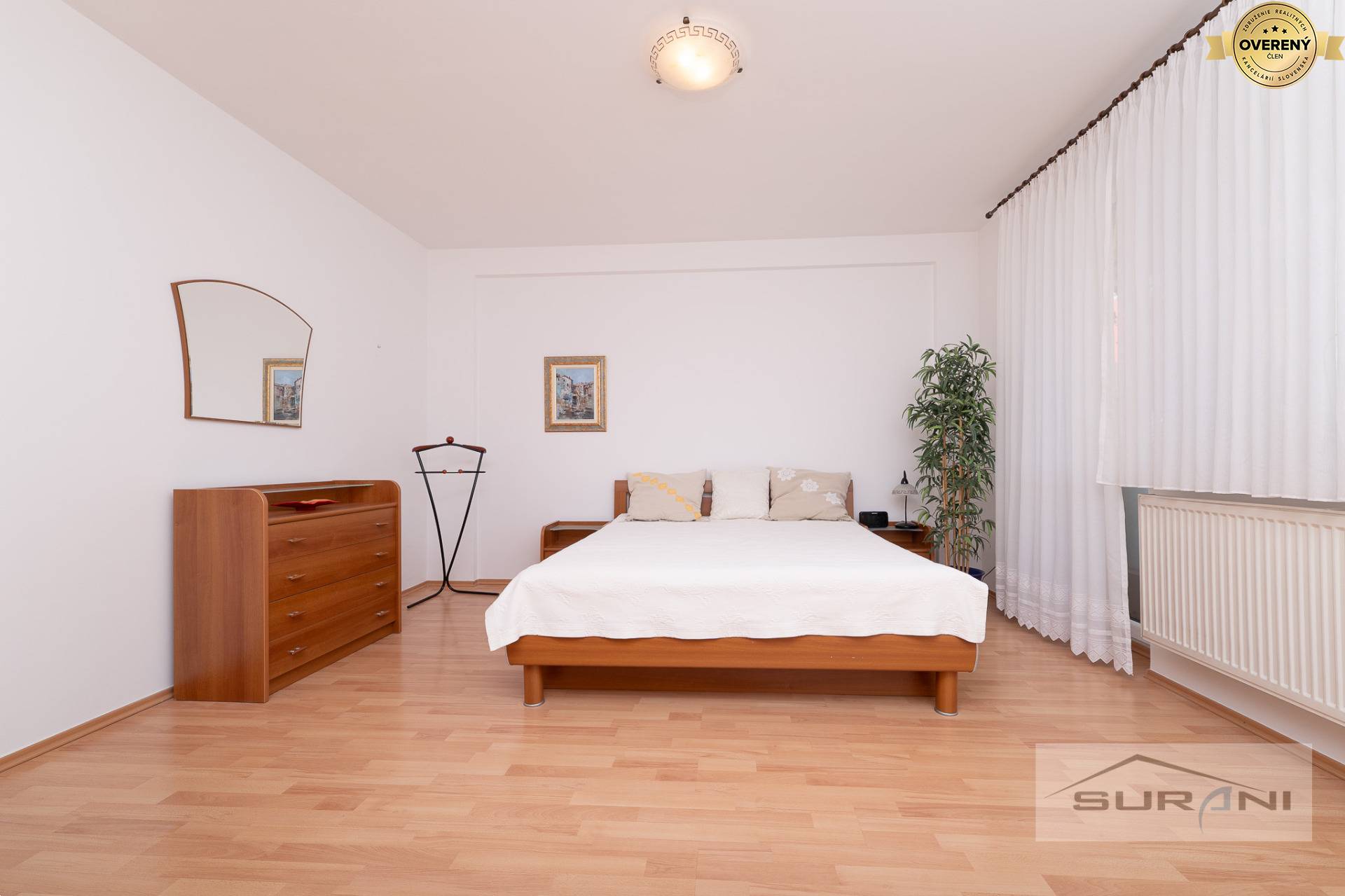 Hlavná spálňa s výmerou takmer 22 m² je orientovaná na východ a má vstup na zasklený balkón.