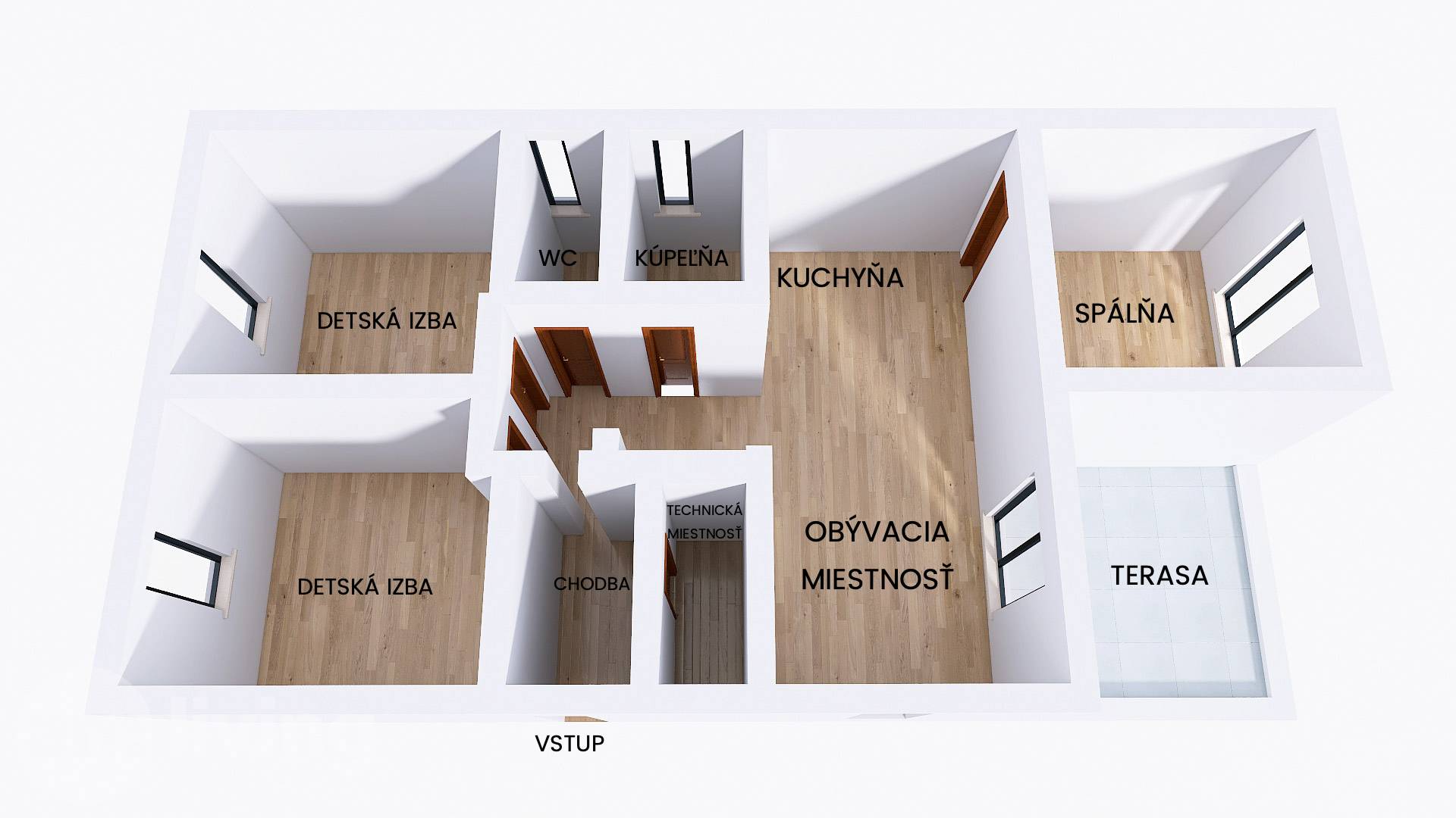 Dispozične riešenie : vstupom sa dostávate do zádveria (vstupnej chodby), z nej sa vchádza do technickej miestnosti, obývacia miestnosť je prepojená s kuchyňou a disponuje východom na terasu i záhradu, spálňa (nachádza sa na opačnom konci domu od dvoch detských izieb) - čo ponúka súkromie a komfort, kúpeľňa je oddelená od toalety a nájdete v nej vaňu i sprchový kút, toaleta je samostatná.