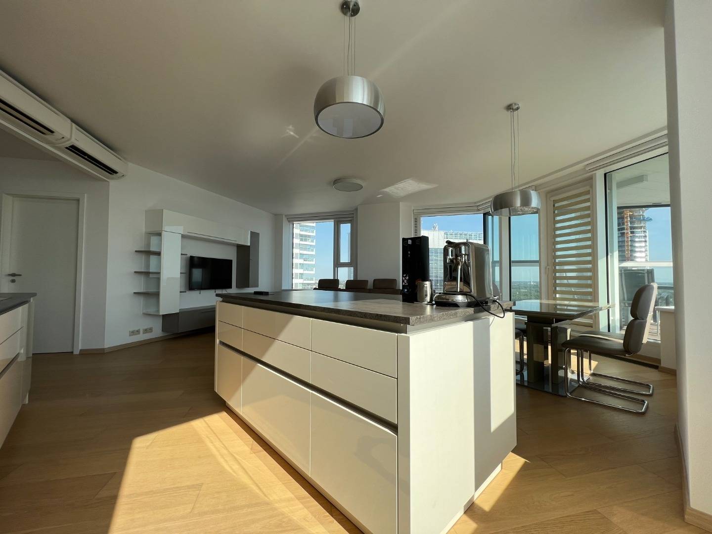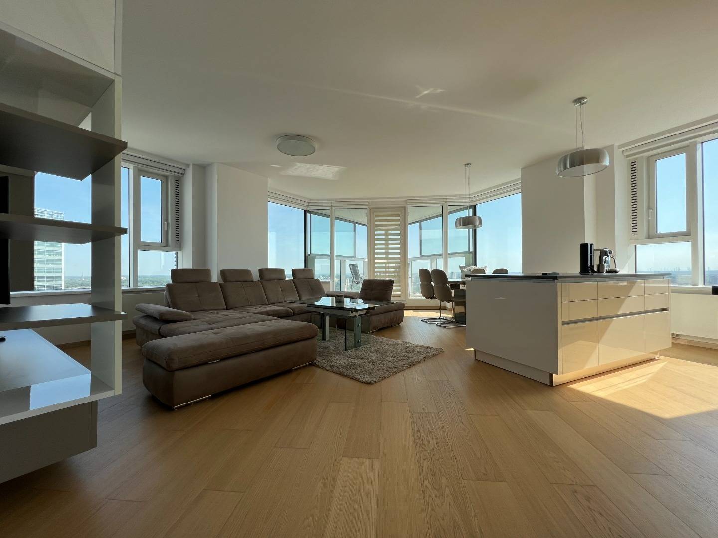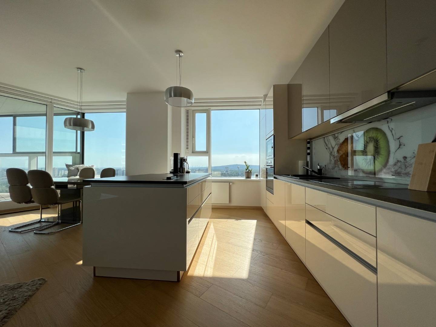 Realitná kancelária NUERA Vám ponúka na prenájom priestranný 3- izbový byt s najkrajším výhľadom v novostavbe Panorama city na Landererovej ulici. Nachádza sa na 26.poschodí z celkových 33 vo veži II, ktorá je bližšie k divadlu. Celková rozloha bytu je 100,72 m2 ( podlahová plocha = 89,80 m2 + loggia = 6,92 m2 + pivnica = 4,00 m2 ).