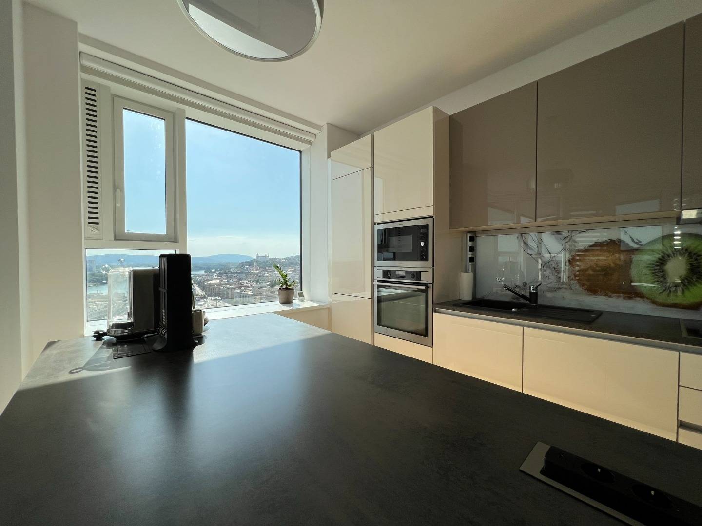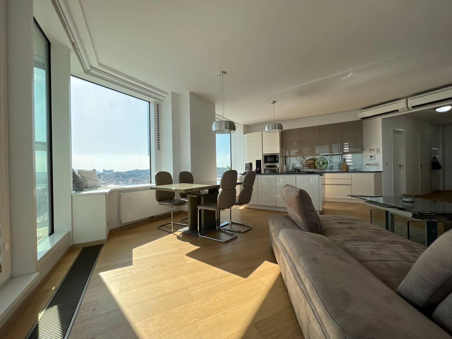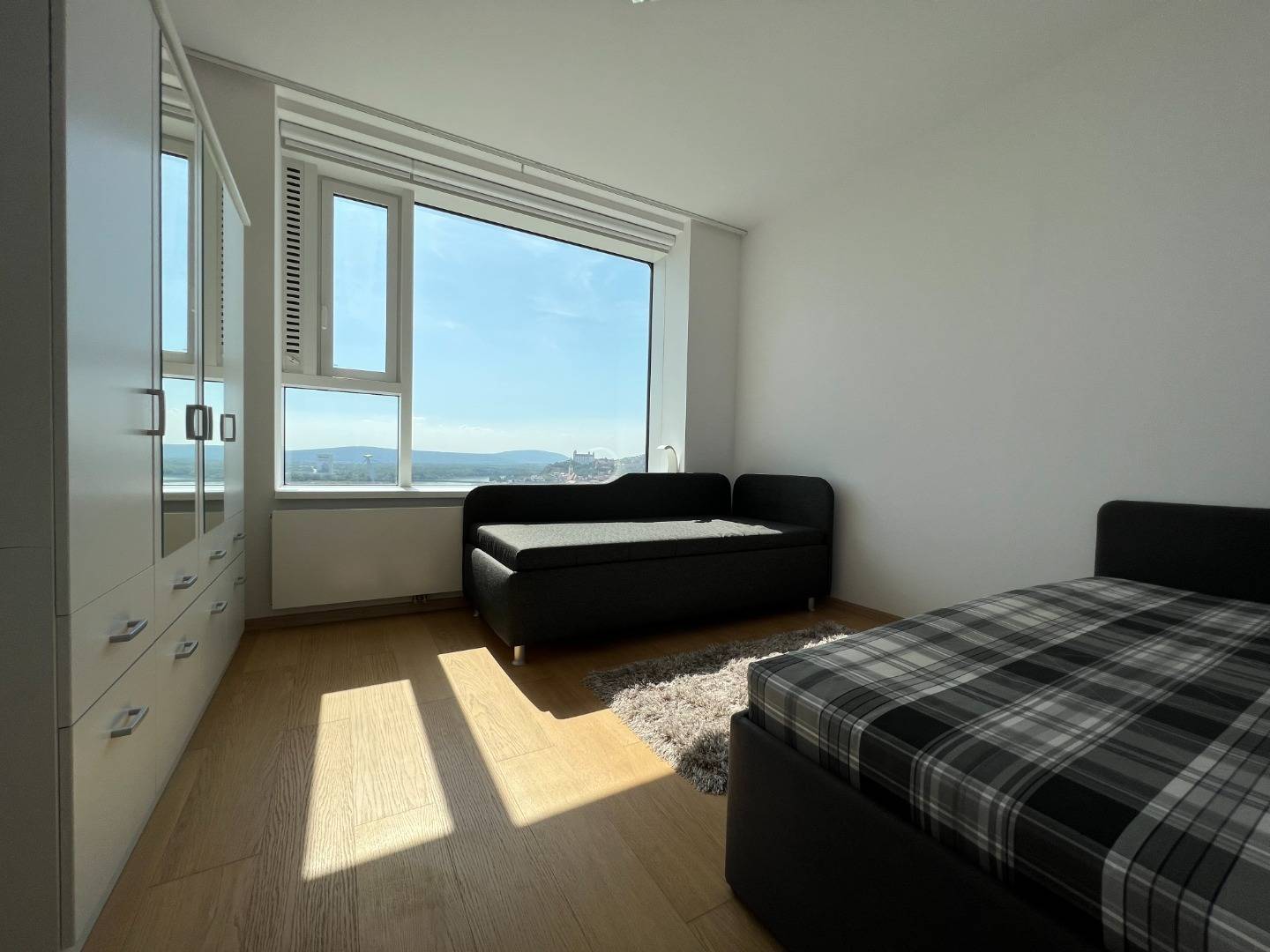 Byt sa prenajíma kompletne zariadený moderným nábytkom vrátane elektrospotrebičov, stačí sa len nasťahovať. Dispozícia - vstupná predsieň, samostatná toaleta, kúpeľňa s vaňou, obývačka s kuchyňou, jedálňou a výstupom na loggiu, samostatná spálňa s druhou kúpeľňou a toaletou, detská izba. Z celého bytu je krásny výhľad smerom na Dunaj, hrad, Staré Mesto, Rakúsko a pod.