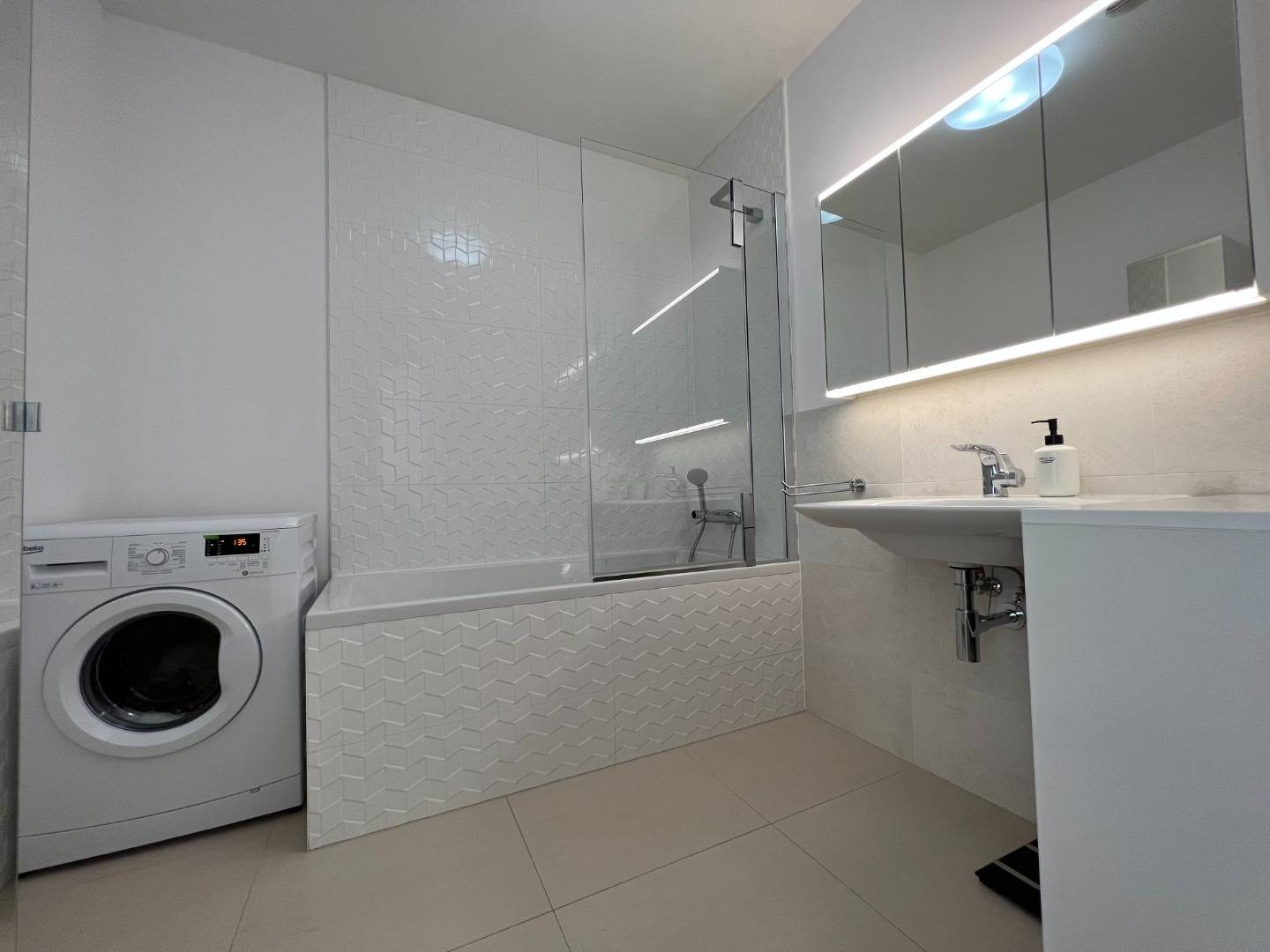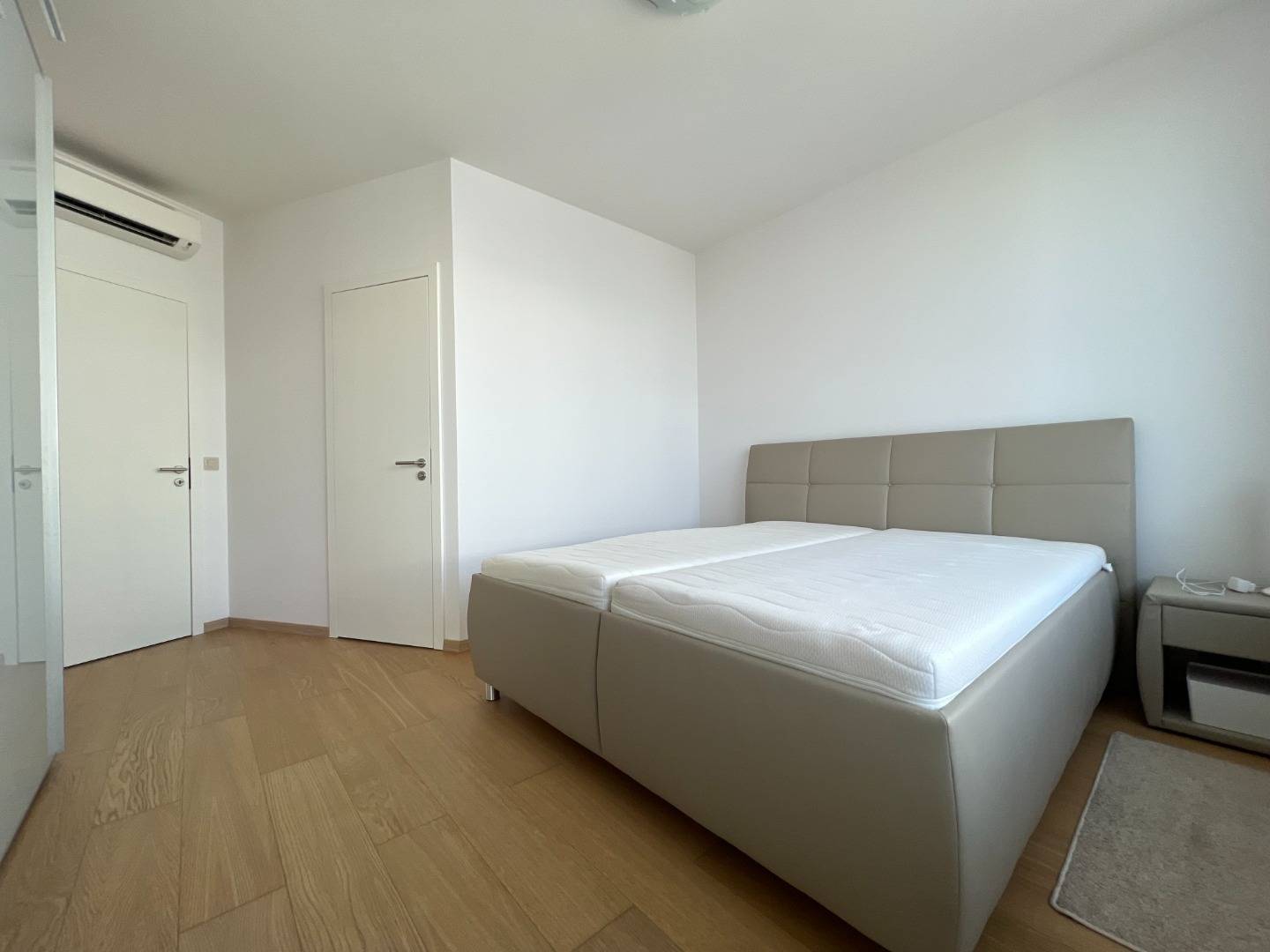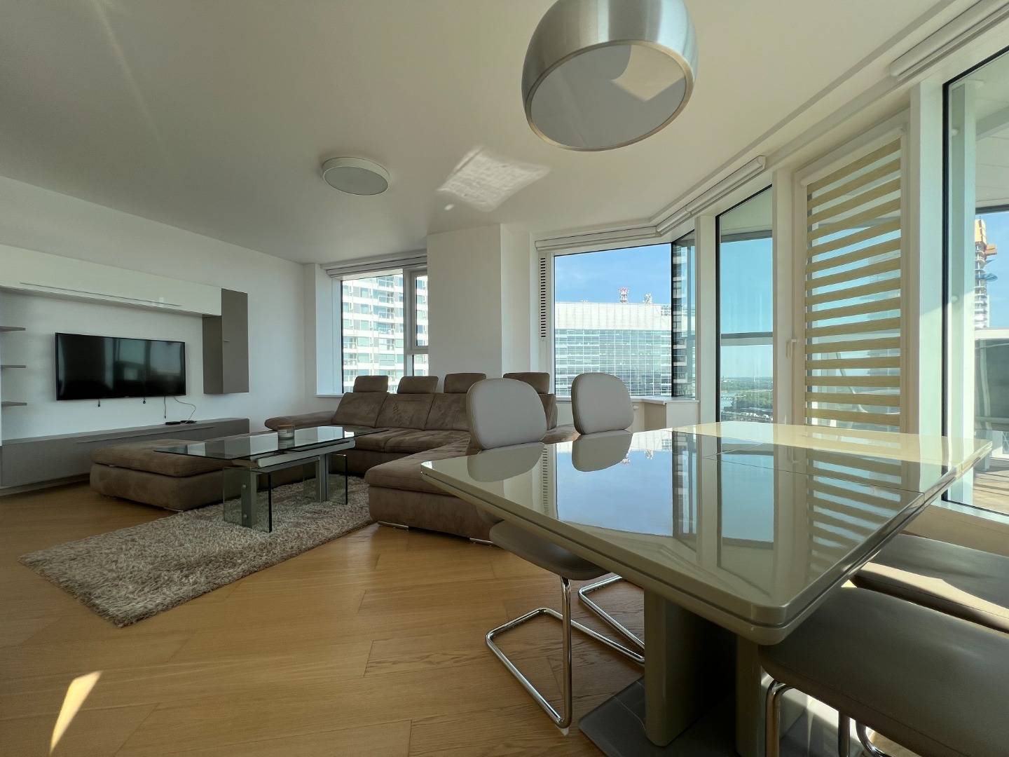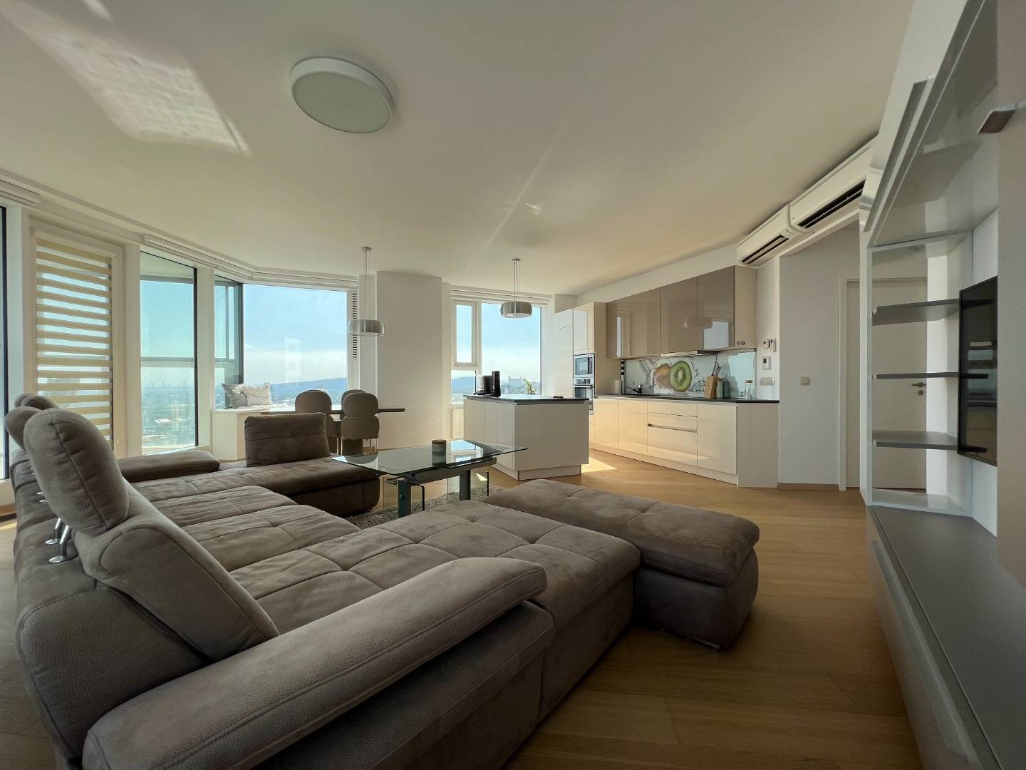 Byt sa prenajíma kompletne zariadený moderným nábytkom vrátane elektrospotrebičov, stačí sa len nasťahovať. Dispozícia - vstupná predsieň, samostatná toaleta, kúpeľňa s vaňou, obývačka s kuchyňou, jedálňou a výstupom na loggiu, samostatná spálňa s druhou kúpeľňou a toaletou, detská izba. Z celého bytu je krásny výhľad smerom na Dunaj, hrad, Staré Mesto, Rakúsko a pod.