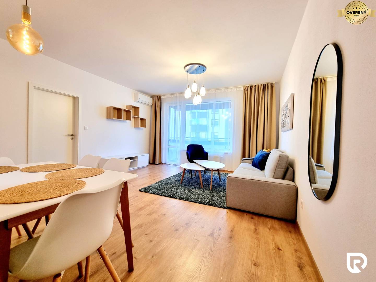 • obývacia miestnosť (sedacia súprava, konferenčný stolík, koberec, obraz, nábytok pod TV, závesy, záclony, moderné svietidlá) spojená s jedálenským stolom s plne vybavenou kuchyňou. V obývacej miestnosti sa nachádza klimatizačná jednotka.
