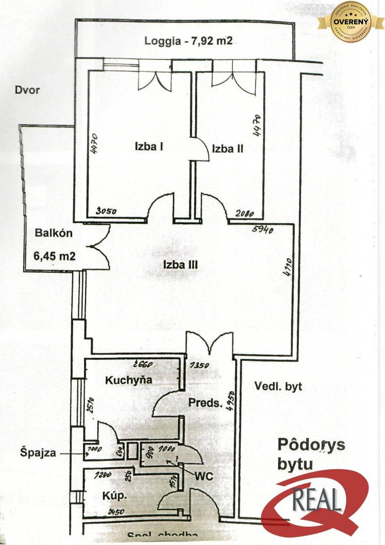 Výmera bytu je 79,44m2 vrátane balkóna 5,84m2 a loggie 7,84m2.