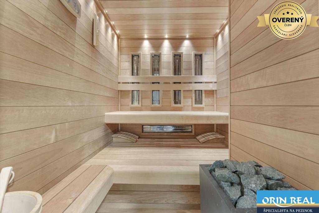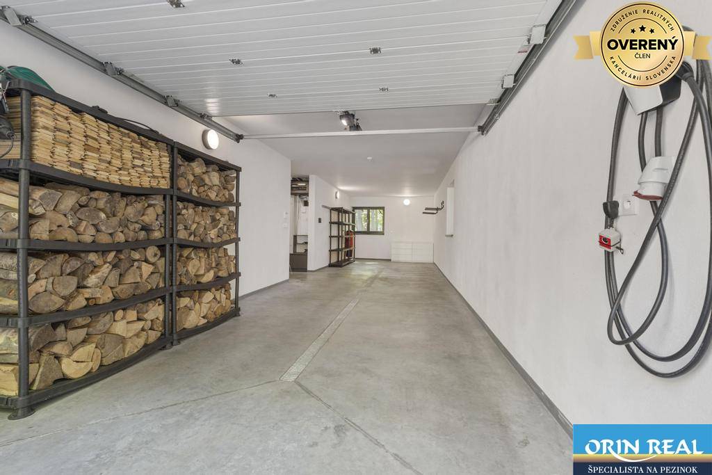 Vybavenie domu: nastaviteľná inteligentná domácnosť, tepelné čerpadlo vzduch - voda, podlahové kúrenie všetkých miestností aj garáže, krb so šamotovými tehlami, rekuperácia všetkých miestností, vinylová podlaha, plastové okná s izolačným trojsklom, hliníkové bezpečnostné dvere, vonkajšie žalúzie, kamerový systém, zabezpečovací systém, alarm, dymový senzor, siréna, senzory pohybu, centrálny vysávač, integrované teplomery vo všetkých miestnostiach, integrované CO2 senzory v izbách, senzory zatvorenia okien a dverí, zvonček na telefón, kombinovaná fínska a infra sauna, vyhrievané terasy a chodníky, 60 m studňa s pitnou vodou, odpadová nádrž, ...