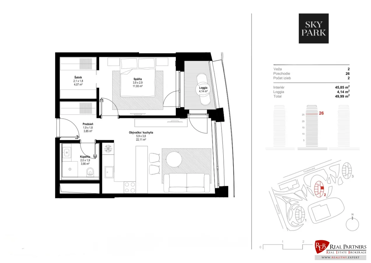 Nadštandardný 2-izbový byt je situovaný na 26. poschodí ikonického rezidenčného komplexu Sky Park v jednej z výškových veží.