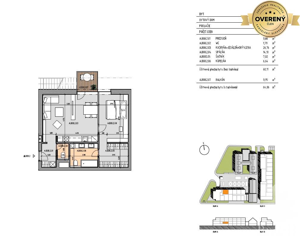 Byt má výmeru 60,48 m2. K bytu prislúcha aj BALKÓN.