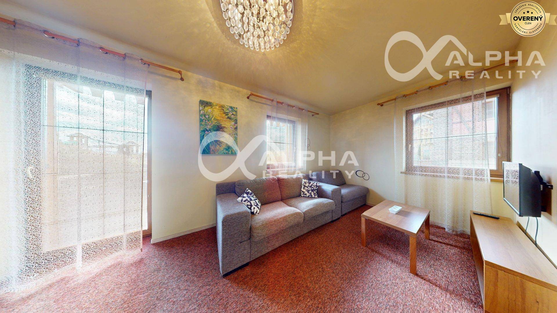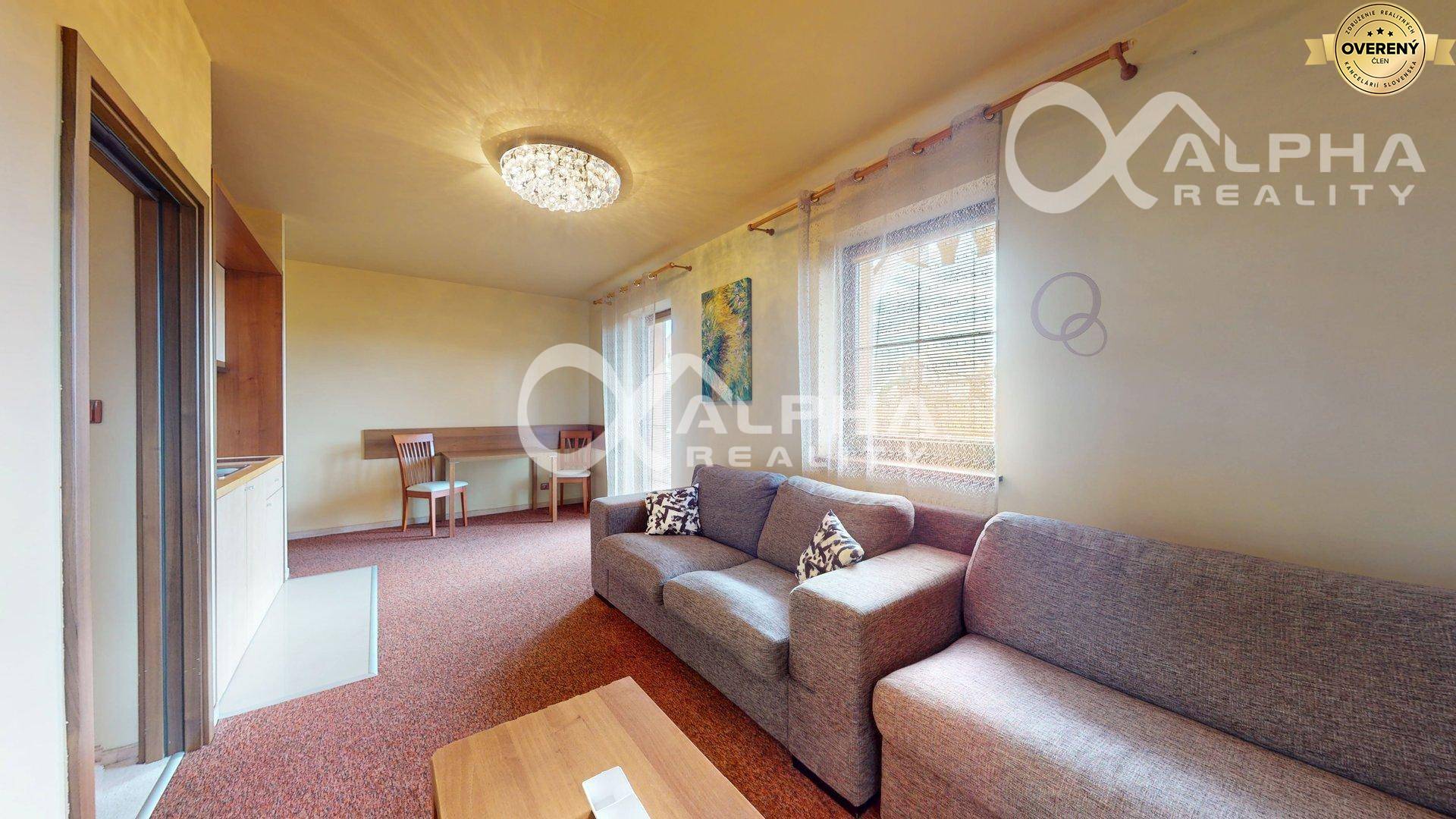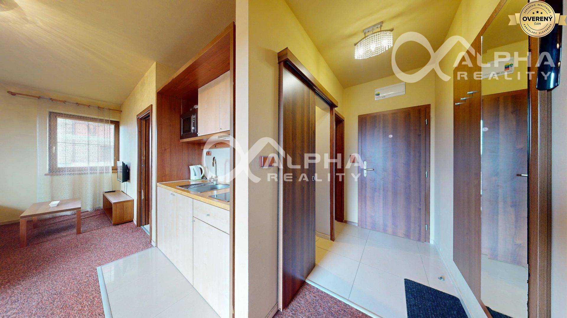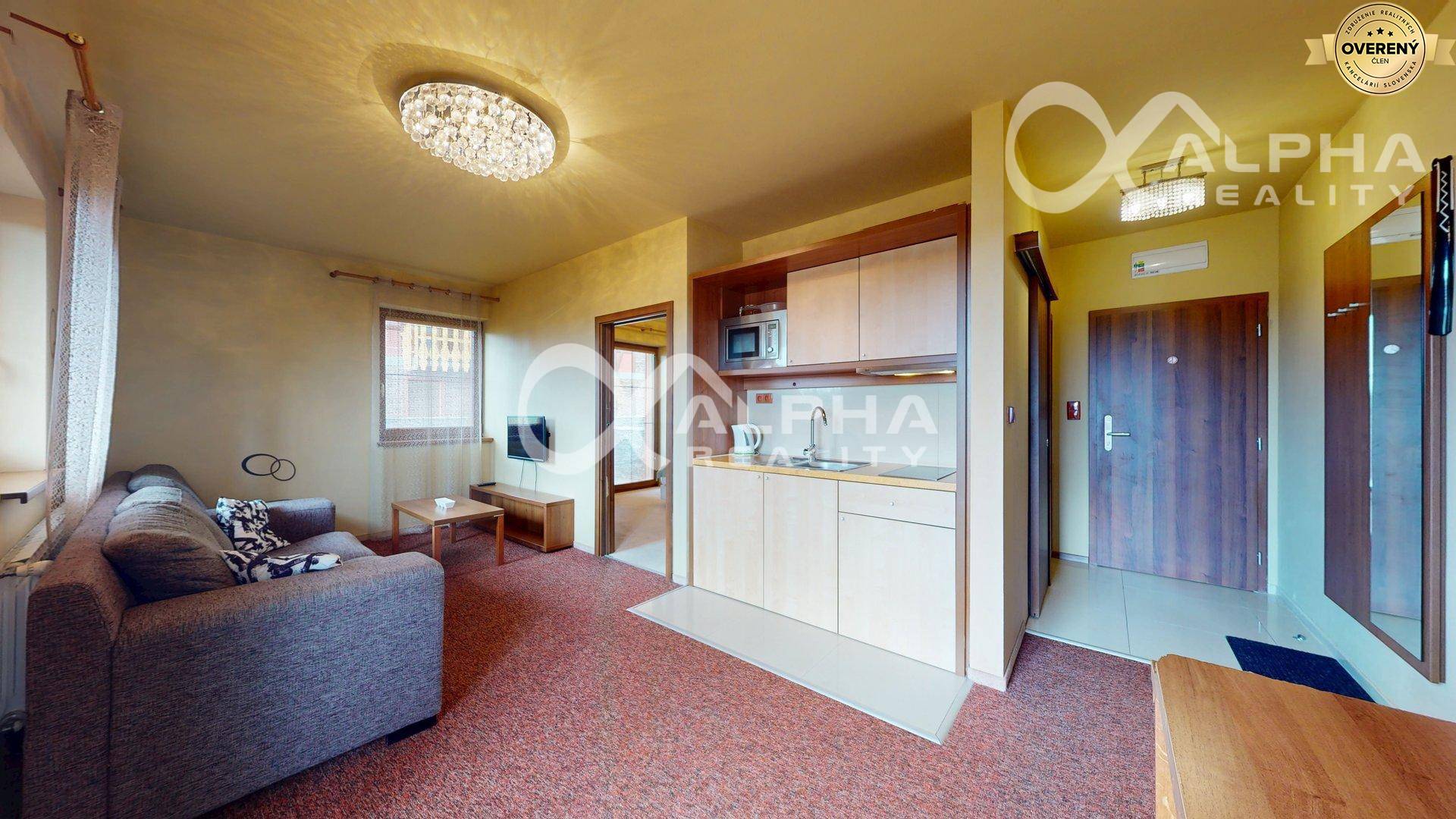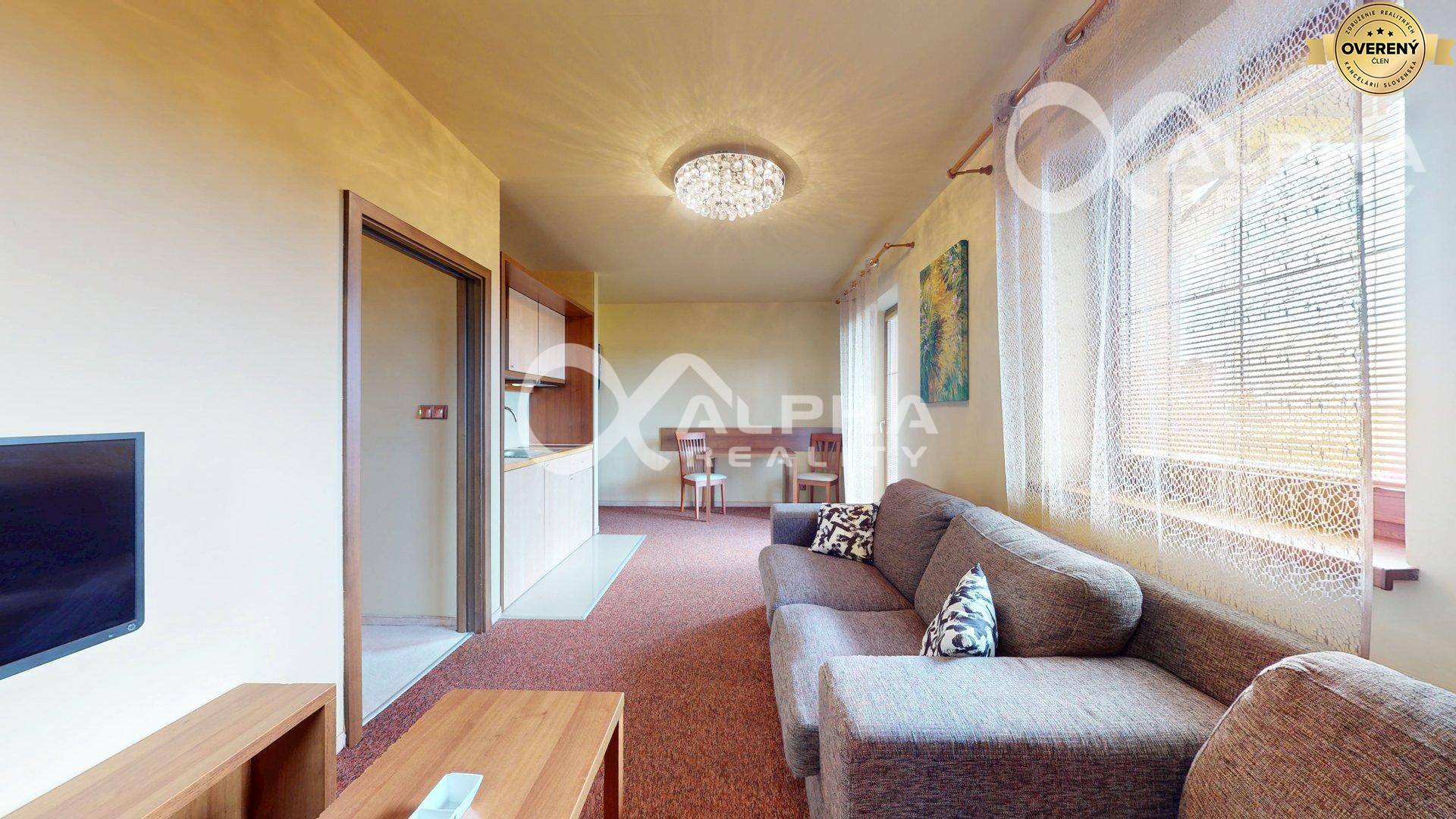-vybavenie bytu: kuchynská linka so spotrebičmi (sklokeramická varná doska, mikrovlná rúra, chladnička, rýchlovarná konvica), stôl, stoličky, rozkladacia pohovka, konferenčný stolík, televízor, vešiakova stena so zrkadlom, manželská posteľ s nočnými stolíkmi, skriňa, kúpeľňa s WC (umývadlo so zrkadlom, sprchovací kút, rebríkový radiátor), terasový nábytok,