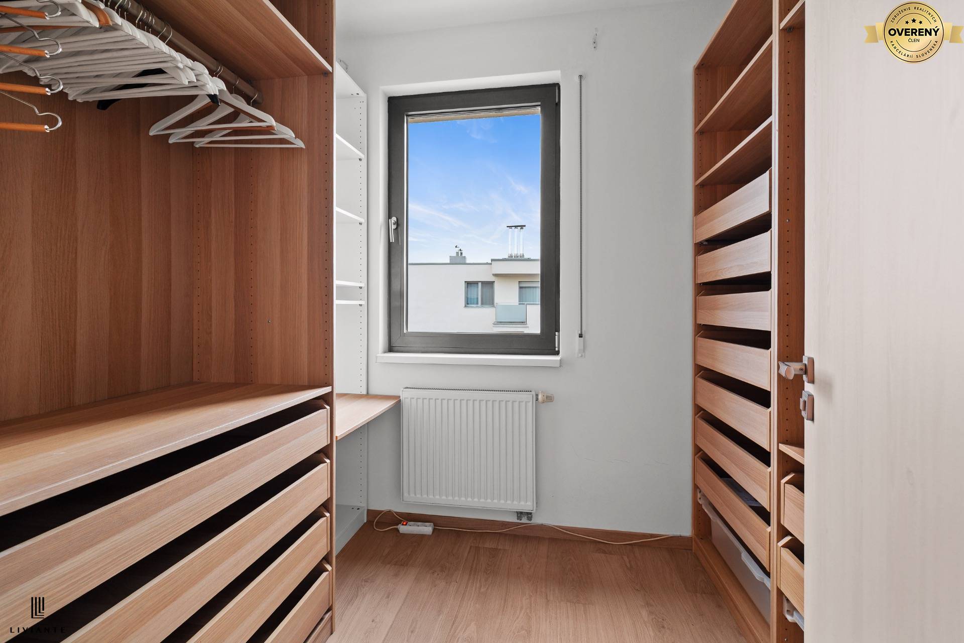 Súčasťou bytu je aj samostatný šatník, ktorý poskytuje ďalší praktický úložný priestor.