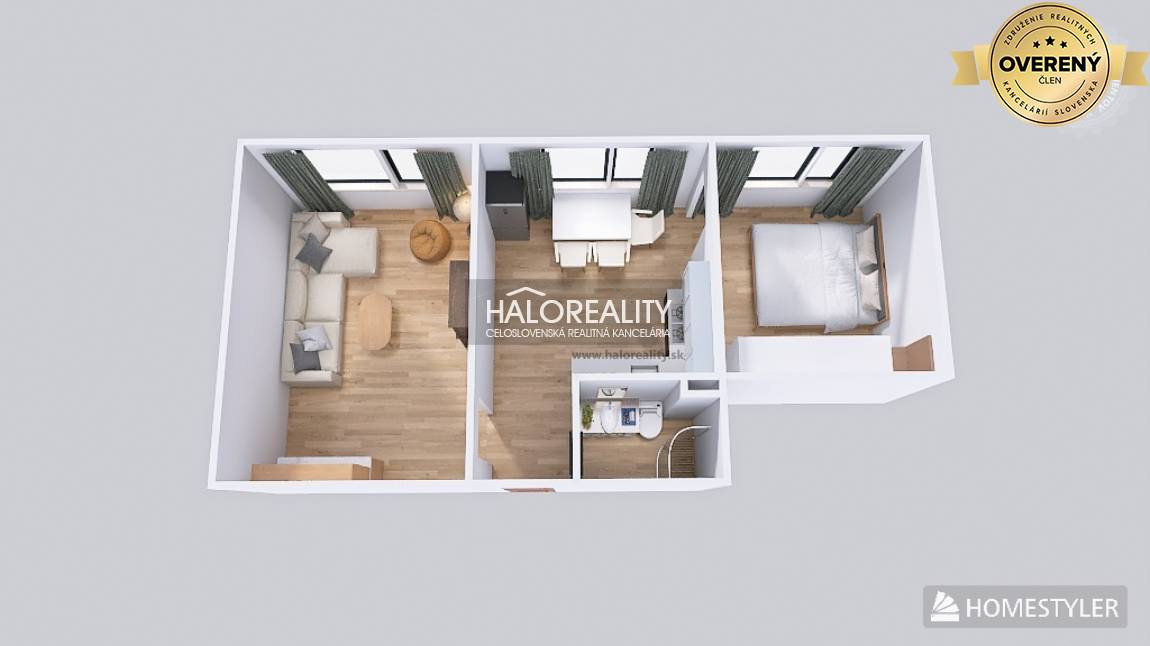 Vstupná chodba, kúpeľňa s wc, obývačka, prechodná kuchyňa do spálne. Byt je svetlý, slnečný.