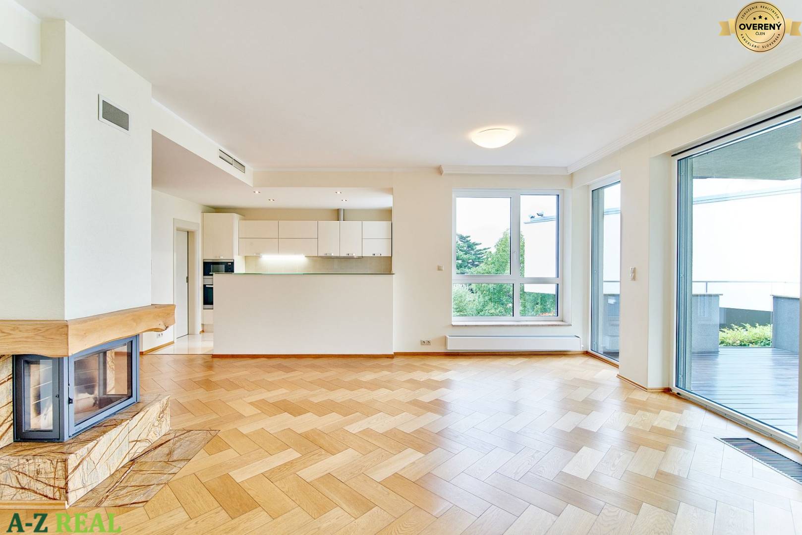 Priestranný, slnečný 3-izbový byt rozlohu 118 m2, má 22 m2 terasu orientovanú do záhrady, ktorá obklopuje celý komplex. Byt pozostáva z predsiene, otvorenej dispozície obývačky, jedálenskej časti a kuchyne, 2 spální, šatníka, kúpeľne s vaňou a sprchovacím kútom s WC a samostatného WC. Terasa je prístupná z obývačky, v ktorej je situovaný krb. Súčasťou vybavenia sú zabudované kuchynské spotrebiče, klimatizácia, drevené parkety, vstavané šatníky, videovrátnik, 24/7 recepcia a nezávislé plynové kúrenie.