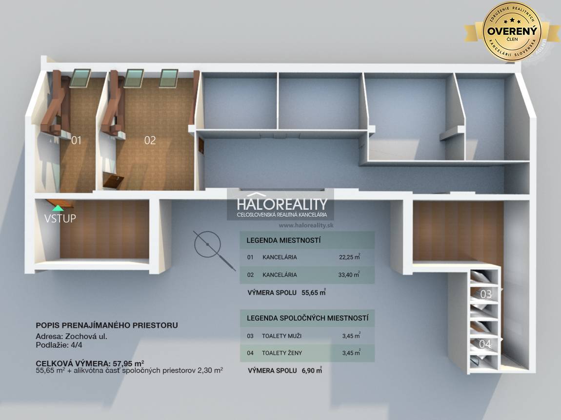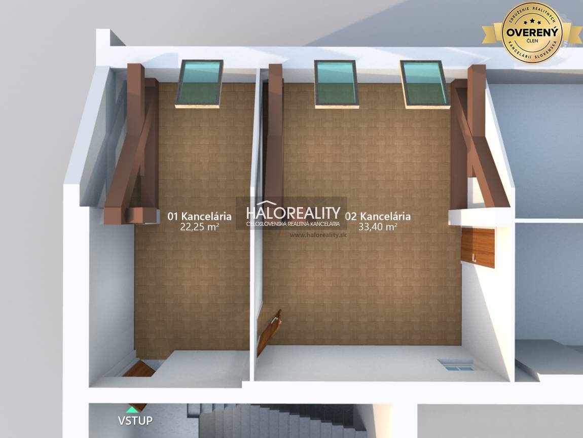 Ponúkame na kancelársky priestor situovaný na 4/4 nadzemných podlaží (4/4 NP) v historickej administratívnej budove s výmerou 57,95 m2 v Bratislave m.č. Staré Mesto. Kancelársky priestor sa skladá z 2 prechodných kancelárií, z haly, chodby a zdieľaných toaliet.