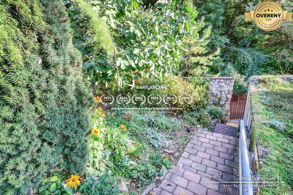 Celý pozemok je oplotený a upravený, pri vstupe sa nachádza murovaný sklad náradia (21 m²), ktorý slúži ako garáž. K domu vedie schodisko s elektrickým stoličkovým výťahom. Na záhrade s vydláždenou terasou a posedením sa nachádza množstvo okrasných a ovocných drevín.