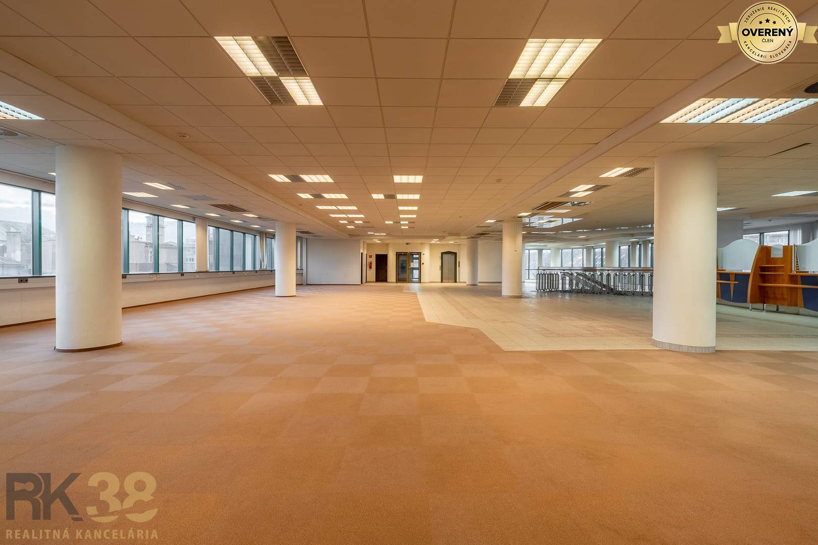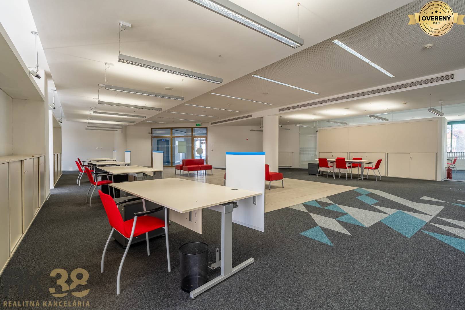 - 1. poschodie – 760 m² - Možnosť prenájmu celého podlažia alebo samostatného zariadeného krídla o výmere 130 m² so zasadačkou a kanceláriou. Podlažie tvorí veľký otvorený administratívny priestor s vlastným sociálnym zázemím, kuchynkou a kanceláriou.