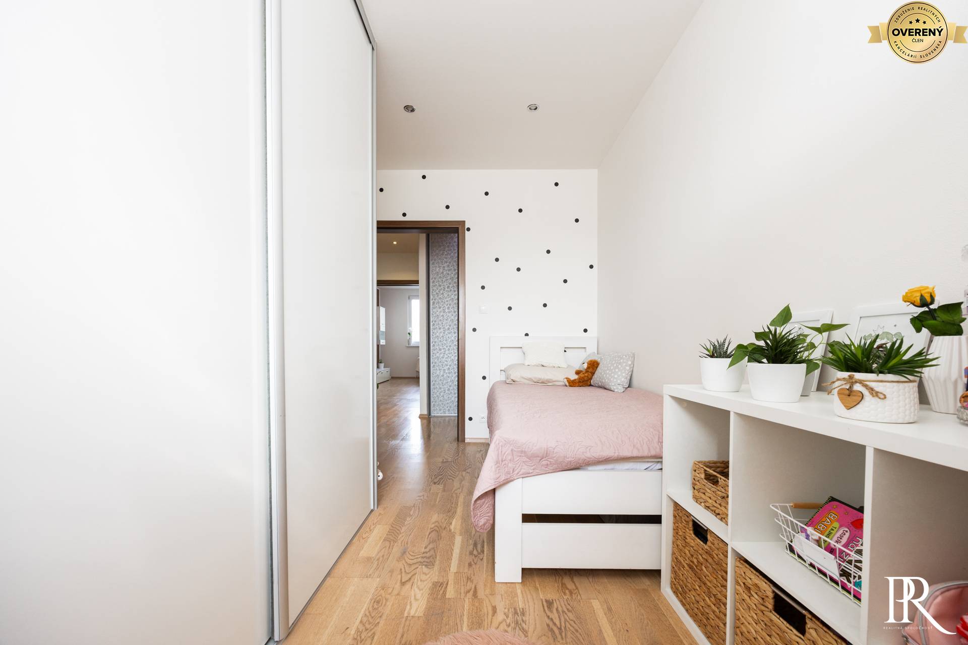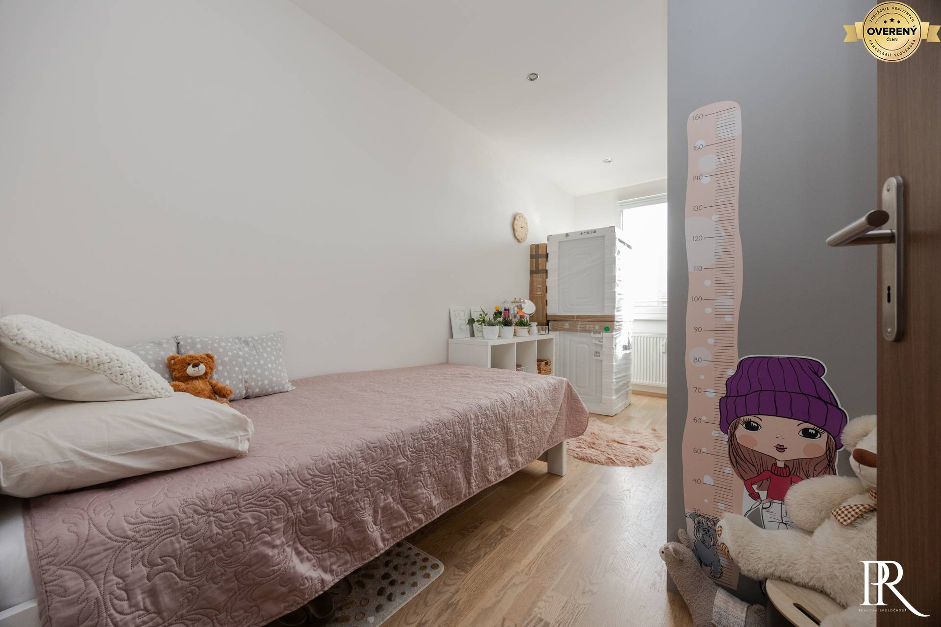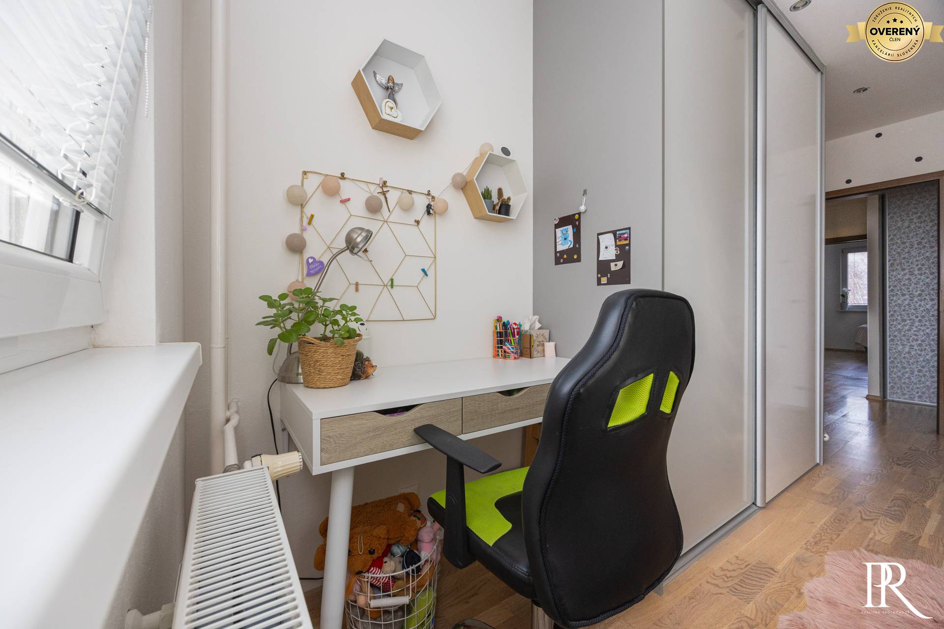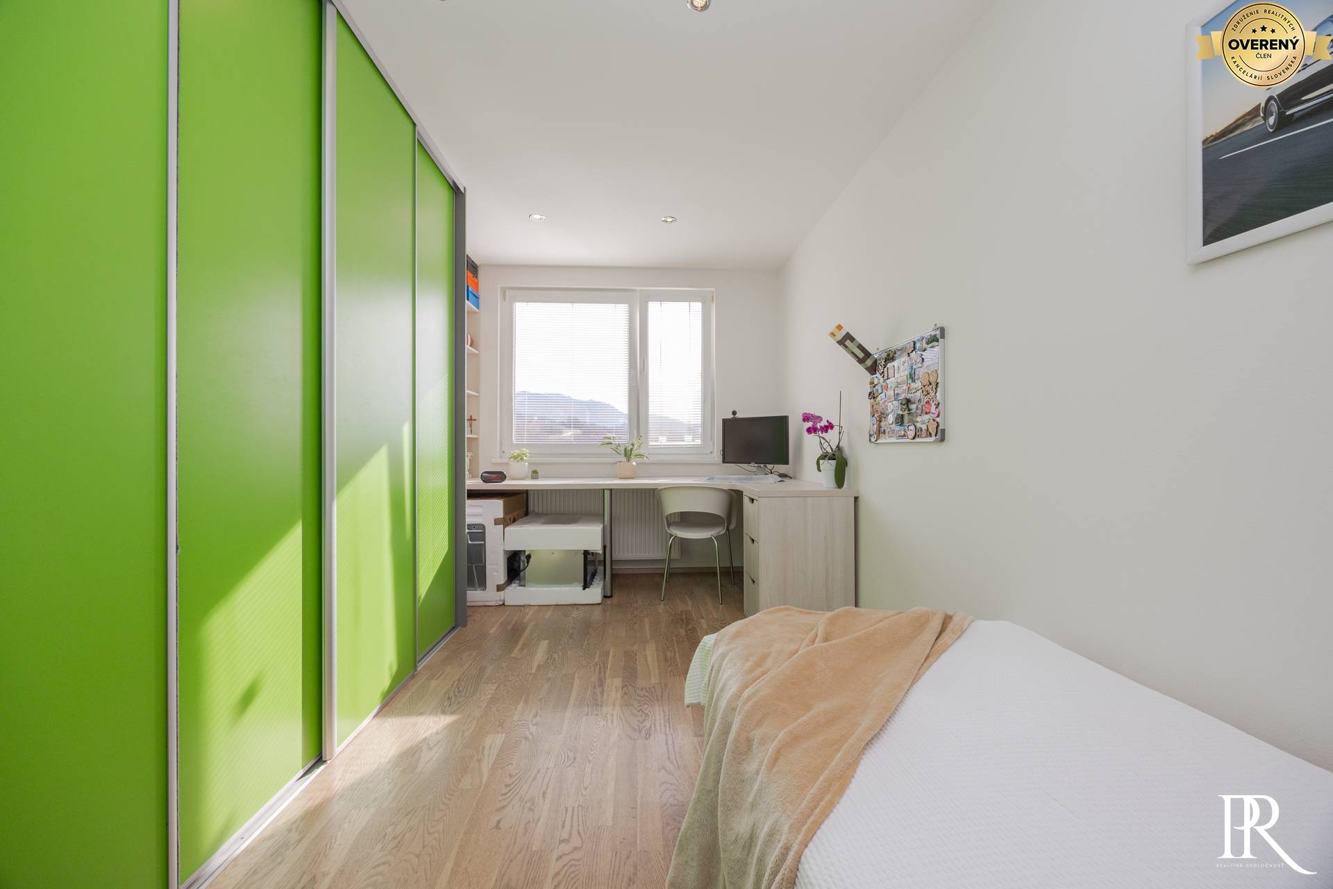 Byt sa nachádza na 4. poschodí (5.podlaží) a disponuje podlahovou plochou 82 m2 + lodžia 2,5 m2 + pivnica 2m2. Už pri vstupe vás privíta široká chodba s dvomi priestrannými roldormi, s množstvom úložného priestoru, pričom prirozdene oddeľuje dennú a nočnú časť bytu. Byt ponúka dve útulné detské izby, kde môžu rásť sny aj veľké plány Vašich detí. Obe izby sú vybavené vstavanou šatníkovou skriňou na mieru a študentským kútikom s pracovným stolom. Hlavná spálňa orientovaná na západnú svetovú stranu je príjemným miestom oddychu s výstupom na zasklenenú lodžiu s krásnymi výhľadmi do vnútrobloku. Srdcom bytu je veľkorysá obývacia izba prepojená s kuchyňou. Tento otvorený priestor je plný prirodzeného svetla a ponúka nádherné výhľady, ktoré si zamilujete každý deň znova. Vzdušnosť a presvetlenie dodávajú bytu jedinečnú atmosféru pokoja a harmónie. Kuchyňa je navrhnutá tak, aby poskytovala komfort pri varení aj dostatok miesta na rodinné stolovanie. Moderná kuchynská linka na mieru je vybavená značkovými vystavanými elektrospotrebičmi (sklo-keramická varná doska, elektrická rúra, mikrovlnka, umývačka riadu/60 cm). Komfort bývania zvyšuje samostatná špajza. Dispozíciu uzatvára kúpeľňa s vaňou so sklenenou zástenou, riešená oddelene od WC.