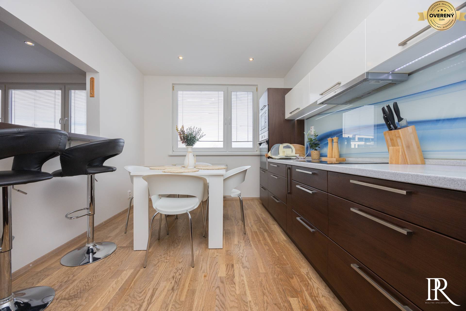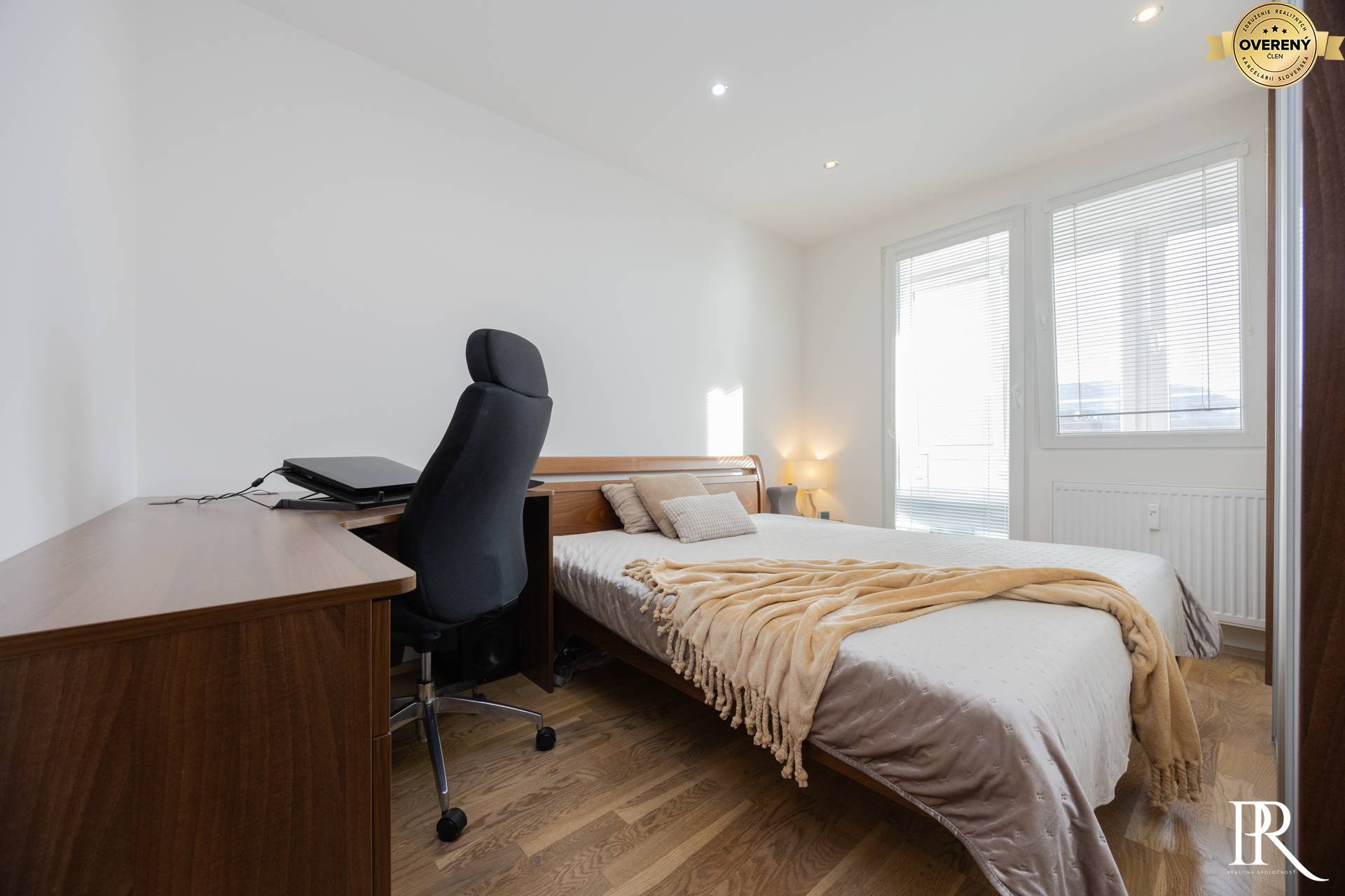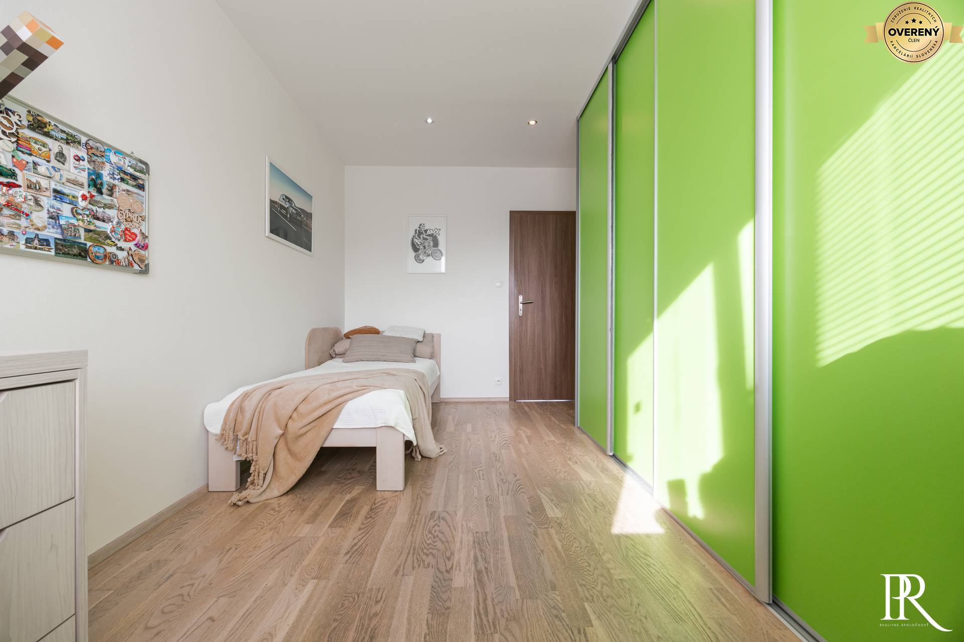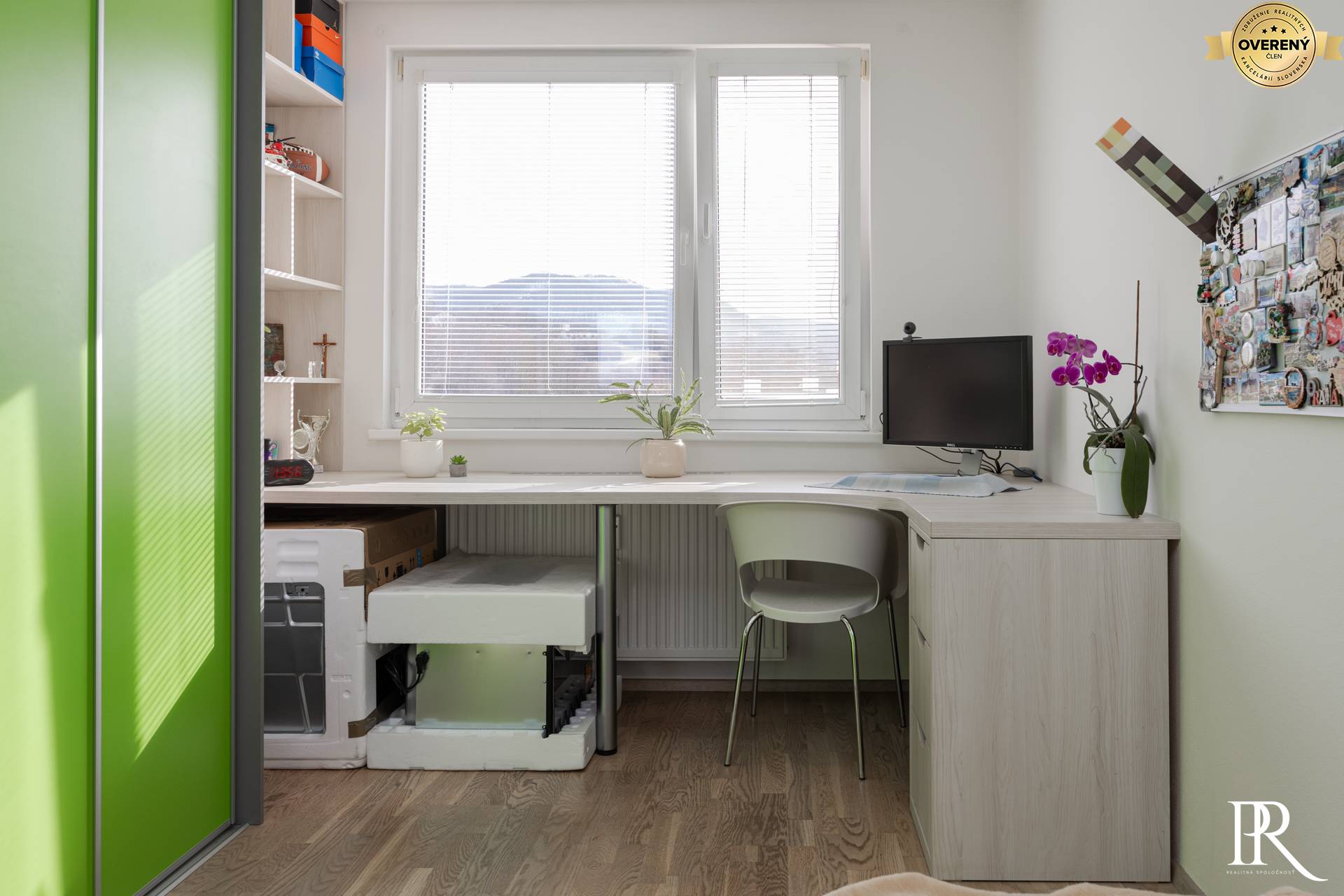 Byt sa nachádza na 4. poschodí (5.podlaží) a disponuje podlahovou plochou 82 m2 + lodžia 2,5 m2 + pivnica 2m2. Už pri vstupe vás privíta široká chodba s dvomi priestrannými roldormi, s množstvom úložného priestoru, pričom prirozdene oddeľuje dennú a nočnú časť bytu. Byt ponúka dve útulné detské izby, kde môžu rásť sny aj veľké plány Vašich detí. Obe izby sú vybavené vstavanou šatníkovou skriňou na mieru a študentským kútikom s pracovným stolom. Hlavná spálňa orientovaná na západnú svetovú stranu je príjemným miestom oddychu s výstupom na zasklenenú lodžiu s krásnymi výhľadmi do vnútrobloku. Srdcom bytu je veľkorysá obývacia izba prepojená s kuchyňou. Tento otvorený priestor je plný prirodzeného svetla a ponúka nádherné výhľady, ktoré si zamilujete každý deň znova. Vzdušnosť a presvetlenie dodávajú bytu jedinečnú atmosféru pokoja a harmónie. Kuchyňa je navrhnutá tak, aby poskytovala komfort pri varení aj dostatok miesta na rodinné stolovanie. Moderná kuchynská linka na mieru je vybavená značkovými vystavanými elektrospotrebičmi (sklo-keramická varná doska, elektrická rúra, mikrovlnka, umývačka riadu/60 cm). Komfort bývania zvyšuje samostatná špajza. Dispozíciu uzatvára kúpeľňa s vaňou so sklenenou zástenou, riešená oddelene od WC.