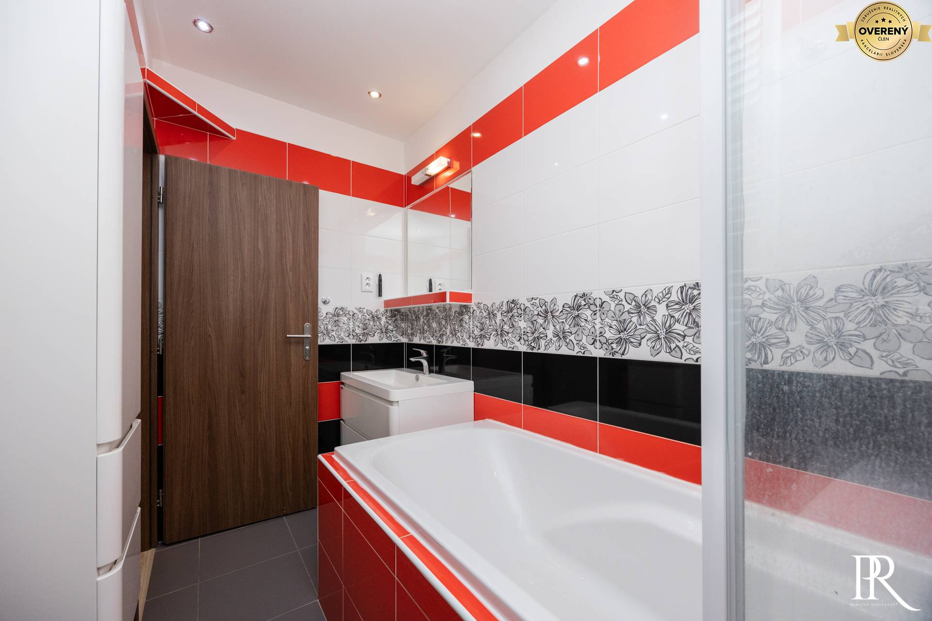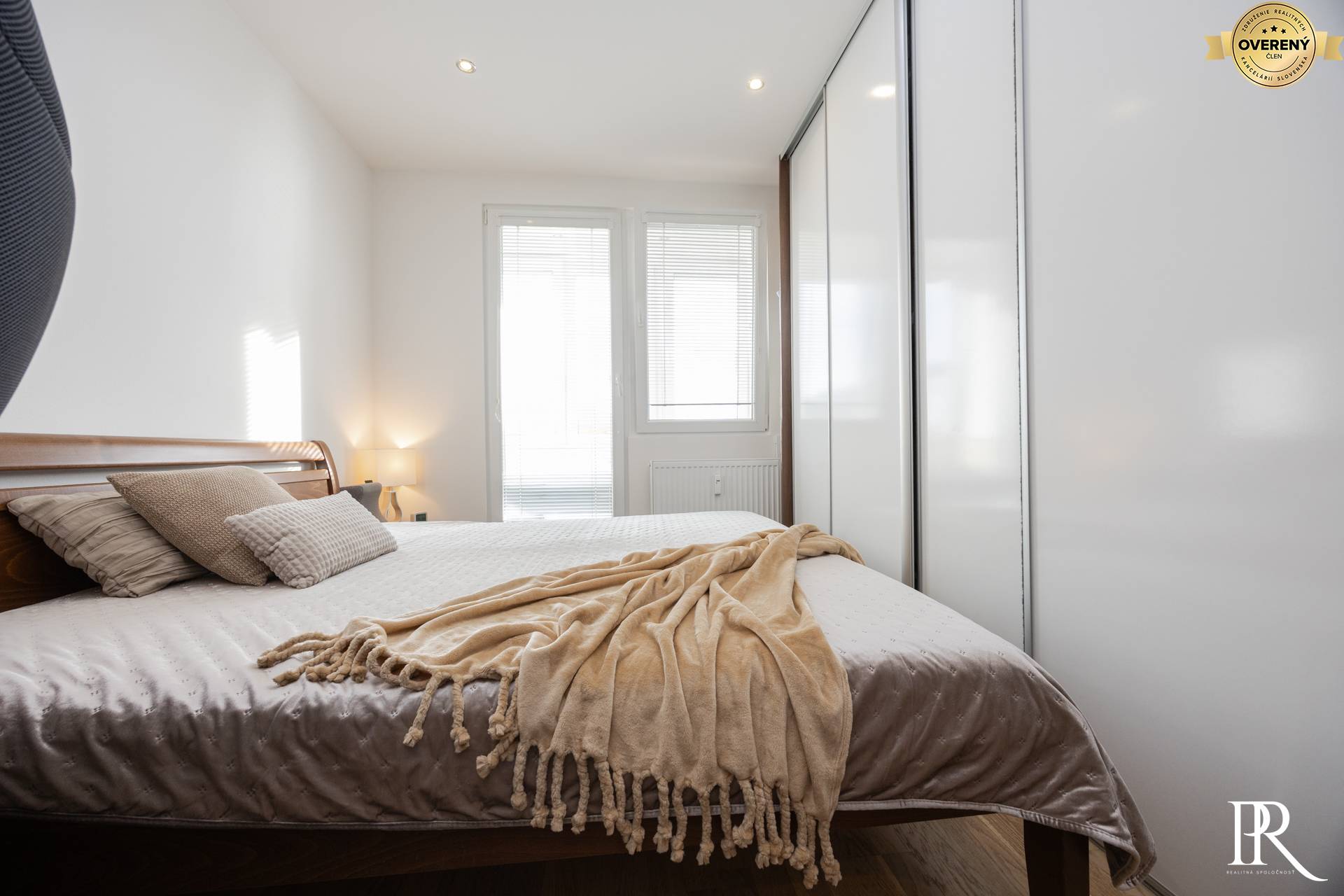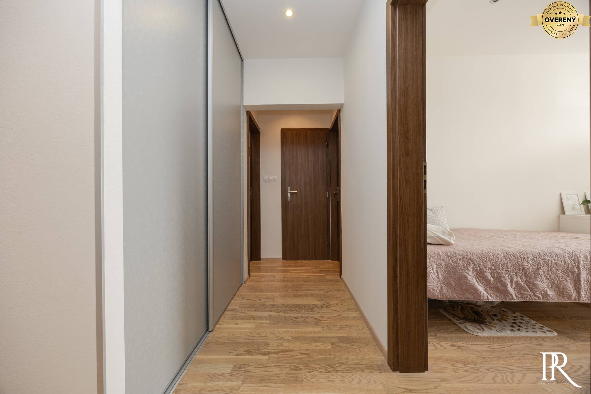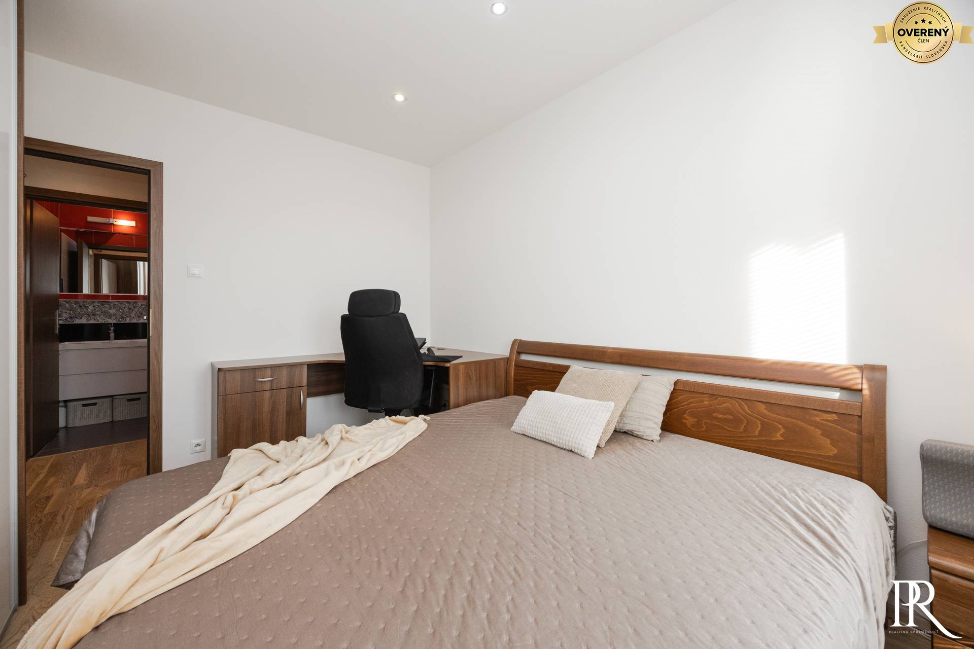 Byt sa nachádza na 4. poschodí (5.podlaží) a disponuje podlahovou plochou 82 m2 + lodžia 2,5 m2 + pivnica 2m2. Už pri vstupe vás privíta široká chodba s dvomi priestrannými roldormi, s množstvom úložného priestoru, pričom prirozdene oddeľuje dennú a nočnú časť bytu. Byt ponúka dve útulné detské izby, kde môžu rásť sny aj veľké plány Vašich detí. Obe izby sú vybavené vstavanou šatníkovou skriňou na mieru a študentským kútikom s pracovným stolom. Hlavná spálňa orientovaná na západnú svetovú stranu je príjemným miestom oddychu s výstupom na zasklenenú lodžiu s krásnymi výhľadmi do vnútrobloku. Srdcom bytu je veľkorysá obývacia izba prepojená s kuchyňou. Tento otvorený priestor je plný prirodzeného svetla a ponúka nádherné výhľady, ktoré si zamilujete každý deň znova. Vzdušnosť a presvetlenie dodávajú bytu jedinečnú atmosféru pokoja a harmónie. Kuchyňa je navrhnutá tak, aby poskytovala komfort pri varení aj dostatok miesta na rodinné stolovanie. Moderná kuchynská linka na mieru je vybavená značkovými vystavanými elektrospotrebičmi (sklo-keramická varná doska, elektrická rúra, mikrovlnka, umývačka riadu/60 cm). Komfort bývania zvyšuje samostatná špajza. Dispozíciu uzatvára kúpeľňa s vaňou so sklenenou zástenou, riešená oddelene od WC.
