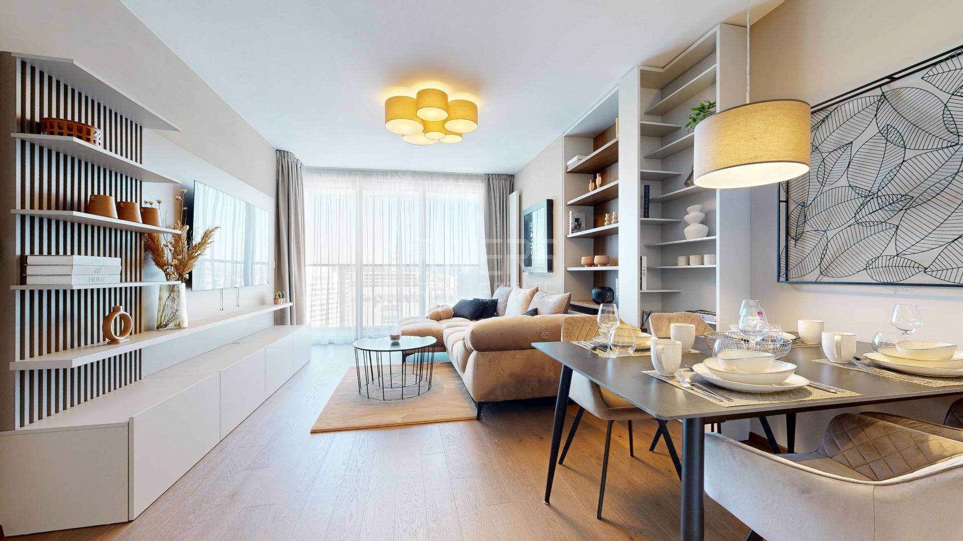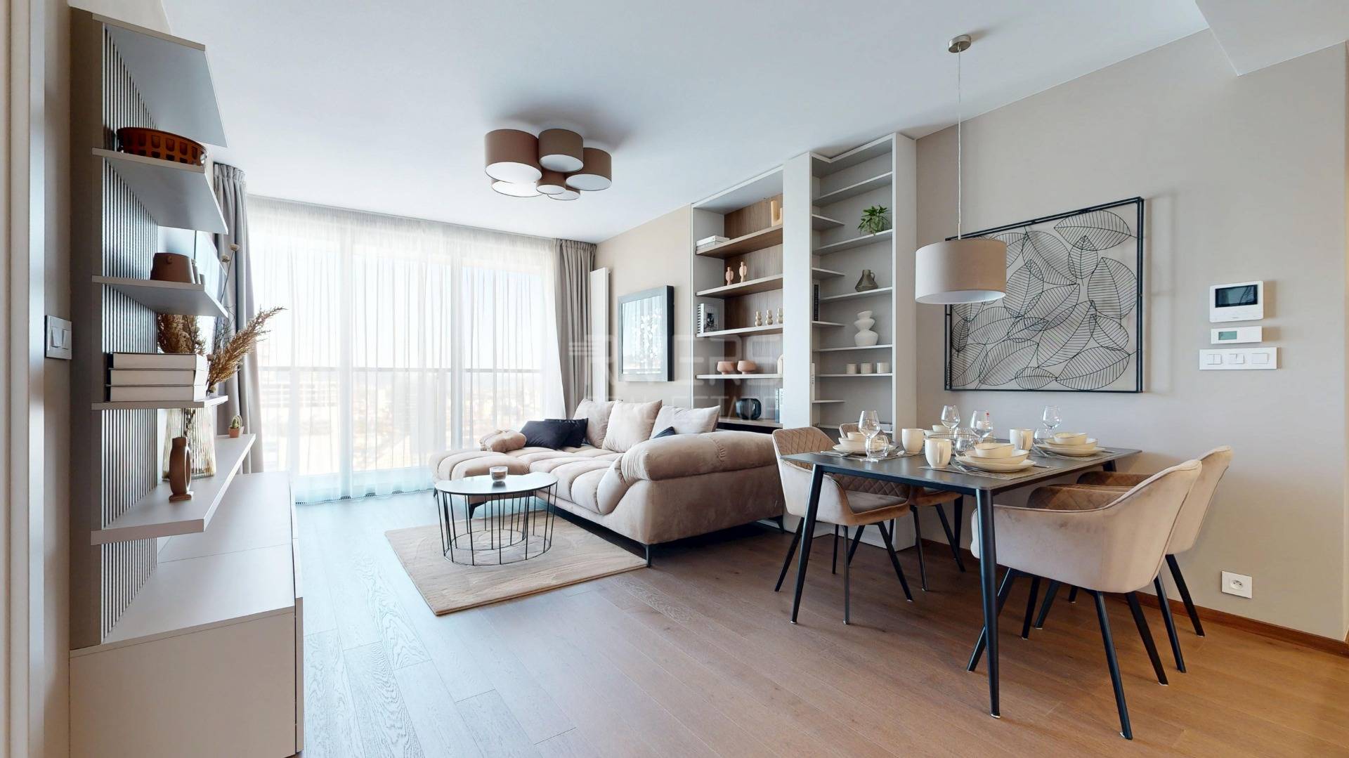 • OBÝVACIA IZBA - na mieru robený nábytok, konferenčný stolík, koberec, dizajnová sedačka, elegantné obrazy a dekorácie, TV značky LG OLED, funkčný internet, na mieru šité záclony a závesy, dizajnové svietidlá