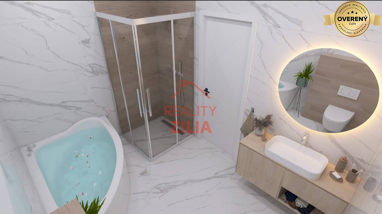 kúpeľňa: predpríprava na vaňu, sprchový kút a dve umývadlá