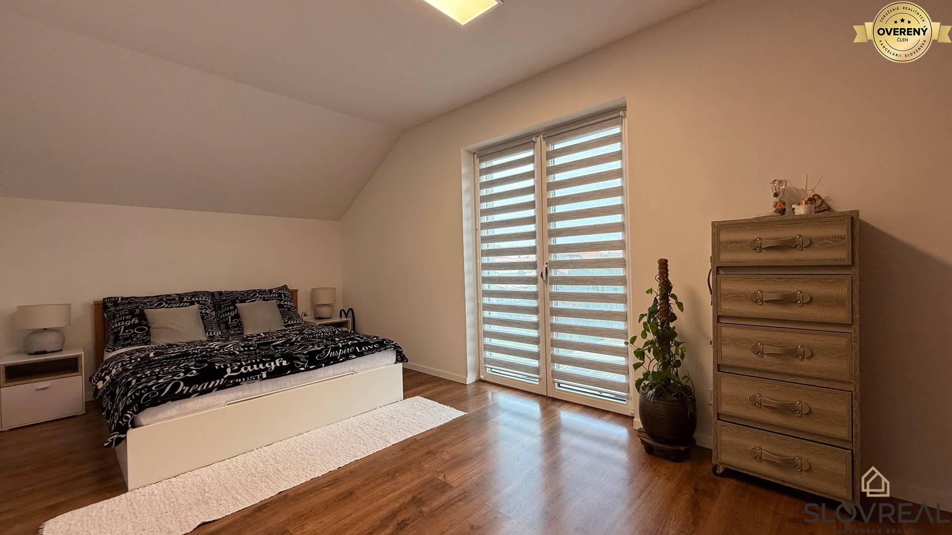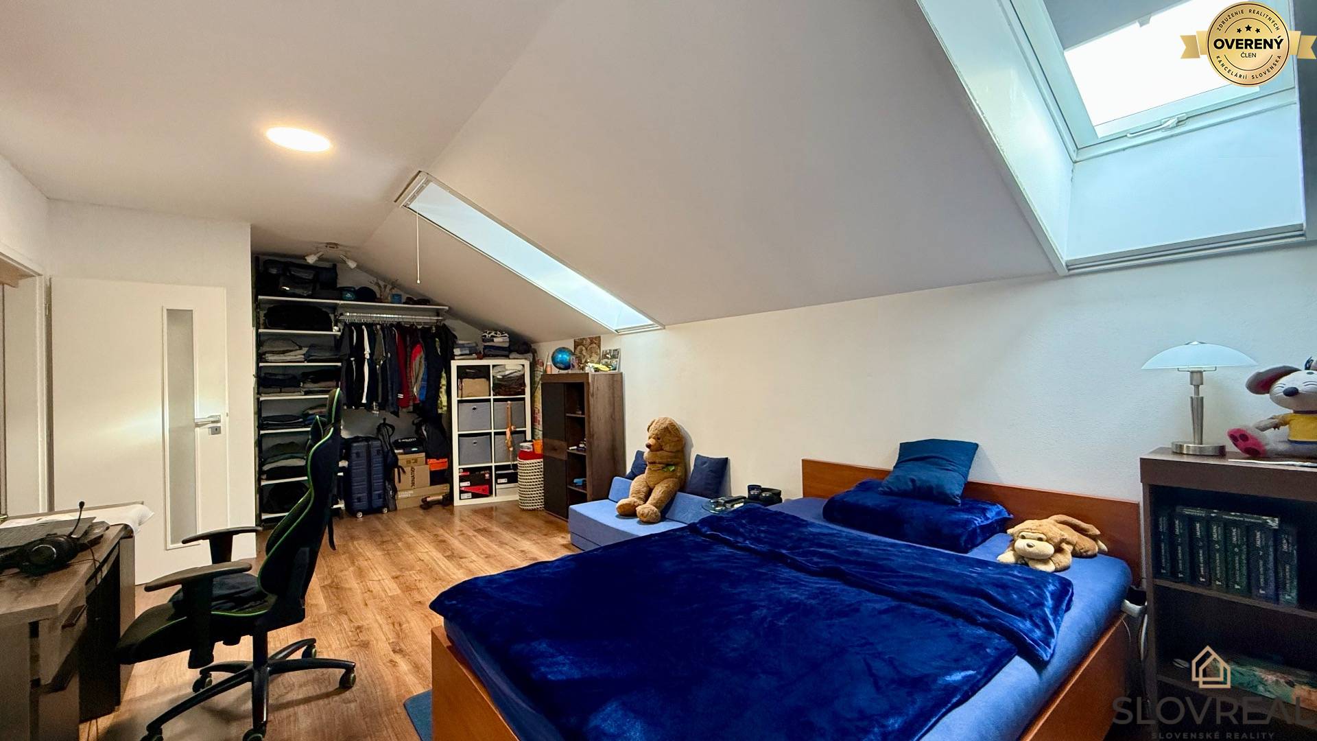 Na poschodí sa nachádza spálňa, obývacia izba, detská izba, kúpeľňa a toaleta ako aj padacie schody