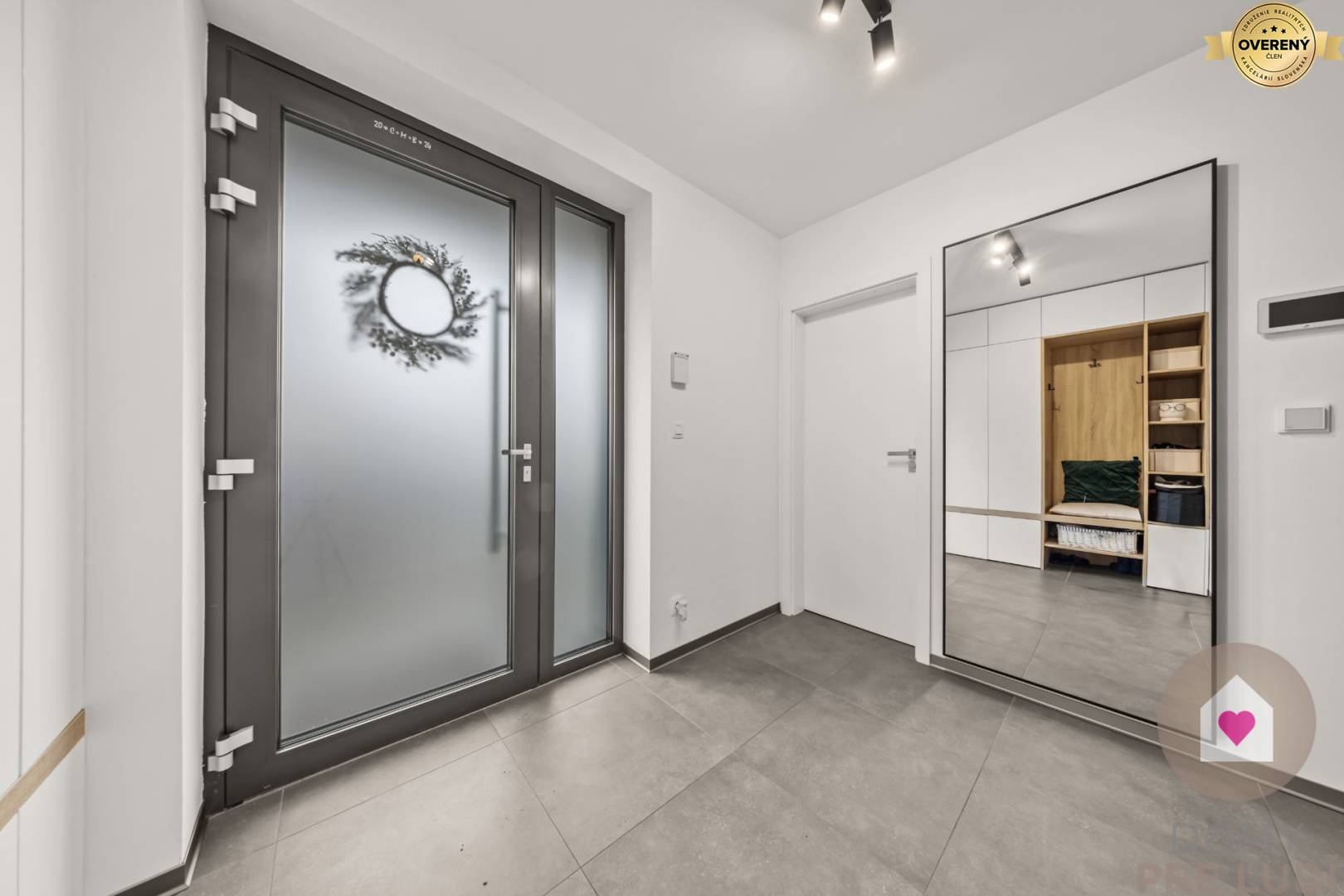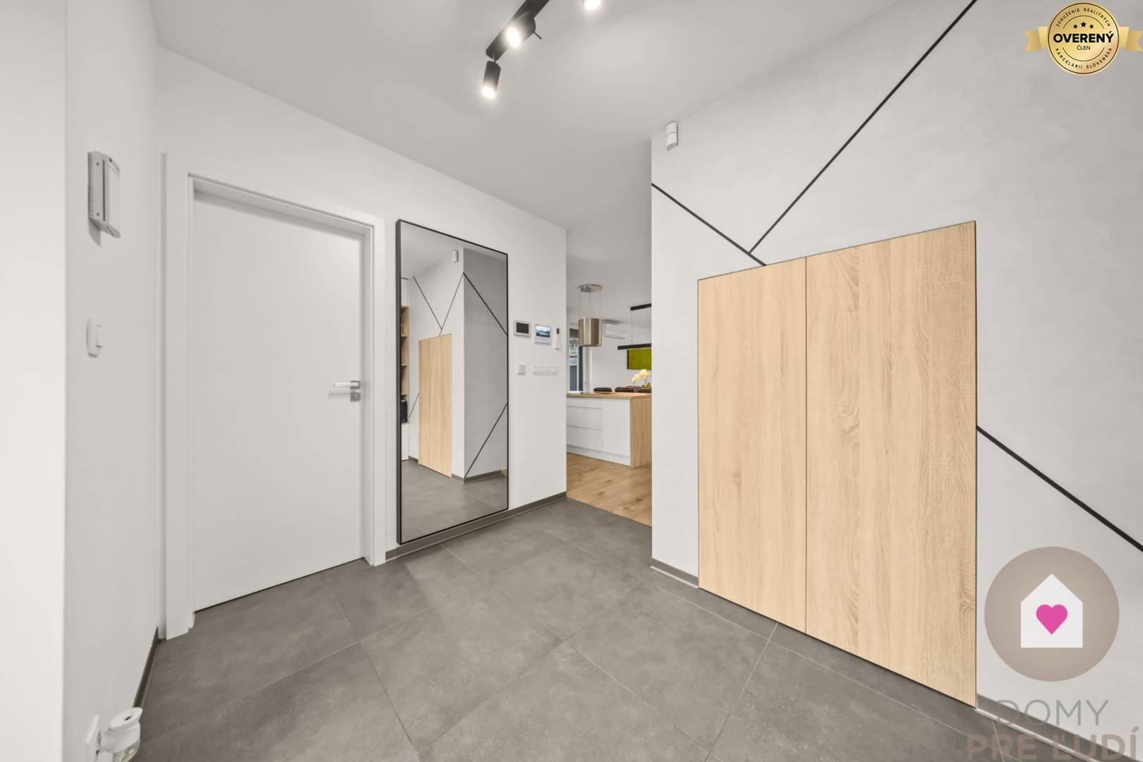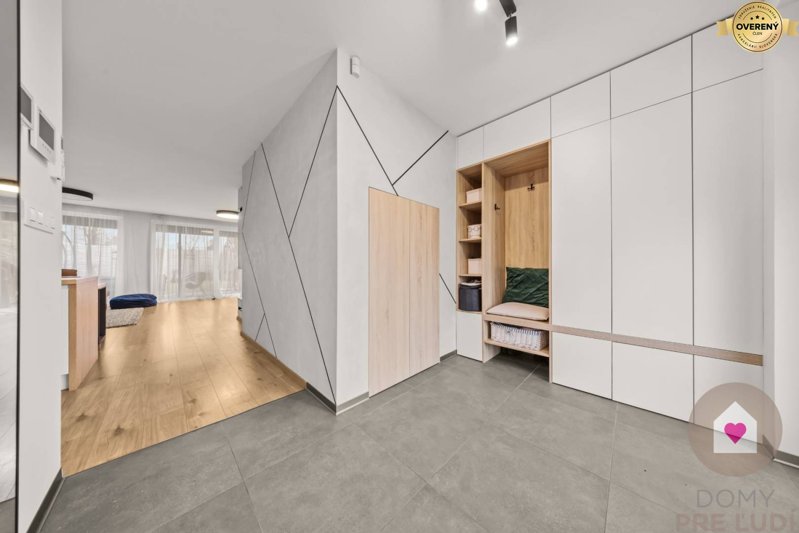 - zádverie so vstavanou skriňou s vešiakom na bundy a botníkom. Vybudovaný tu bol taktiež veľký a praktický uzatvárateľný úložný priestorom pod schodiskom