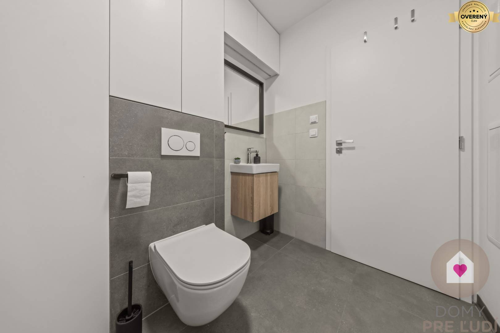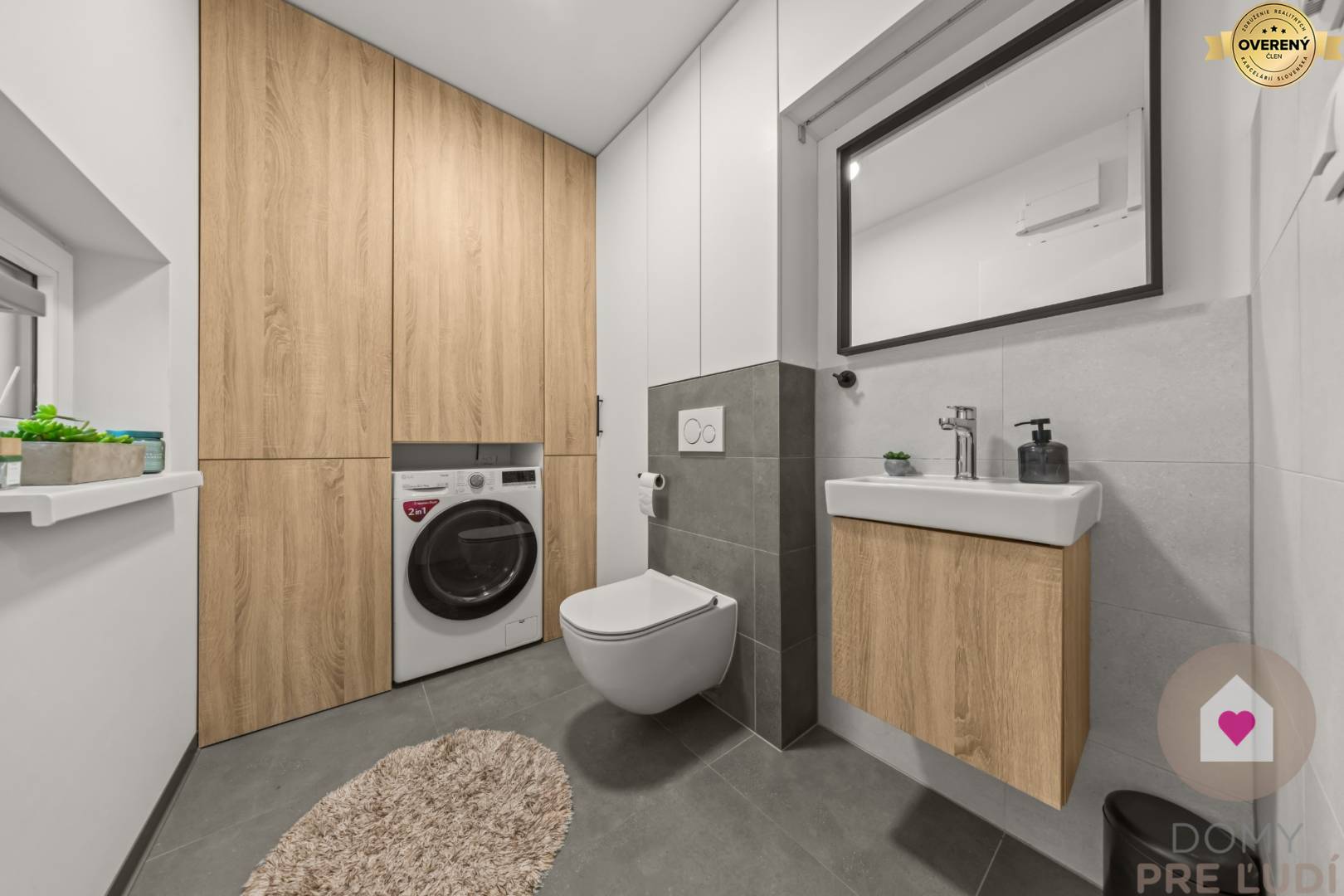 - priestranná technická miestnosť s oknom, so samostatnou toaletou s umývadlom, skrinkou pod umývadlom a vstavanou skrinkovou zostavou s úložným priestorom, v ktorej je zabudovaný el. bojler slúžiaci na ohrev vody a práčka
