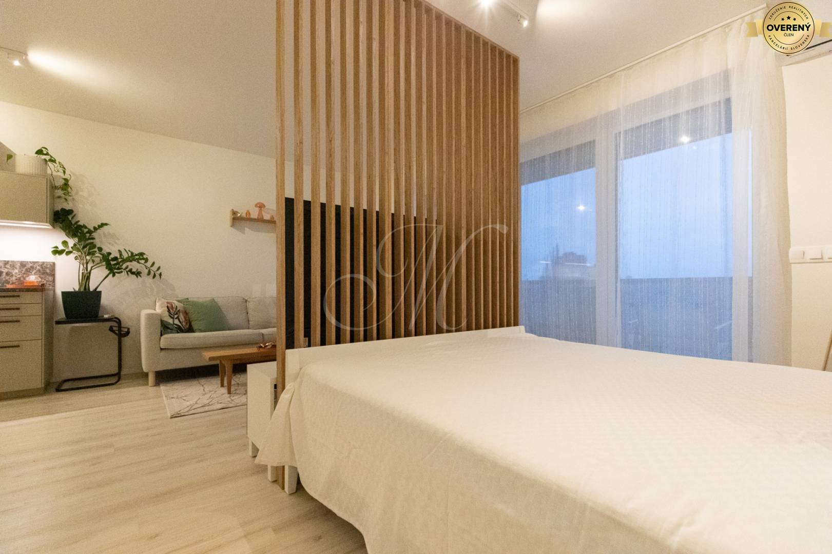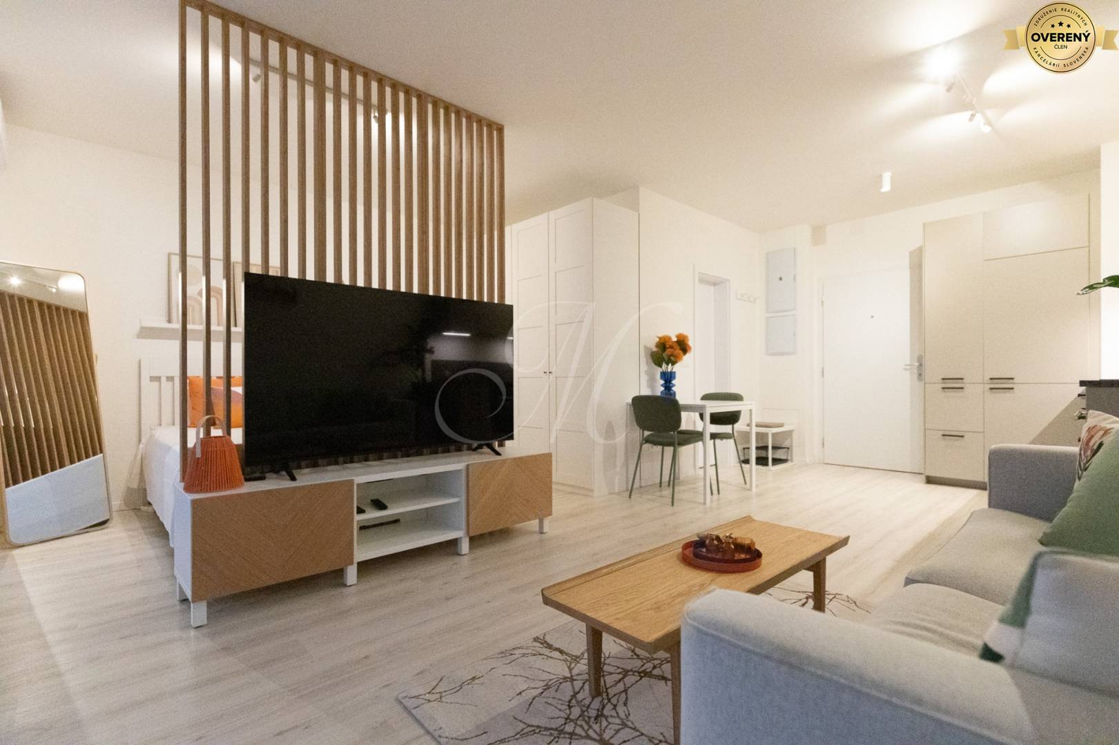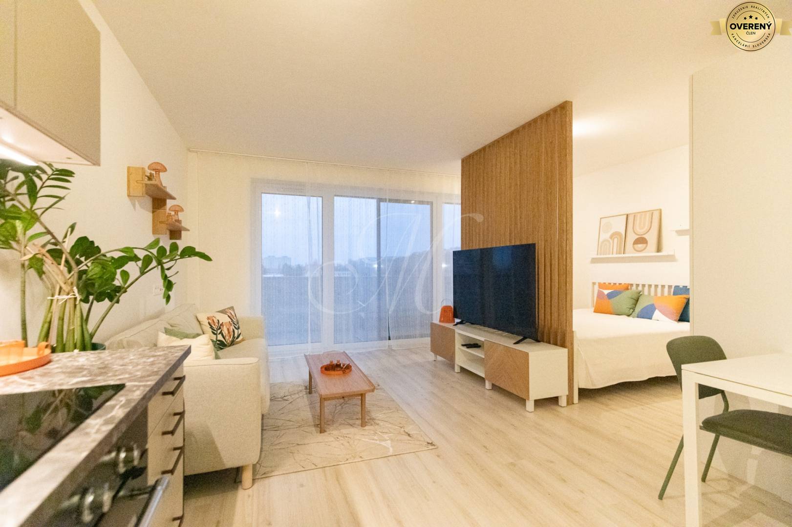 Obytný priestor pozostáva zo svetlej obývacej izby prepojenej s kuchyňou a jedálenským kútom, samostatnej spálňovej časti s dvomi vysokými skriňami a vstupom na priestrannú loggiu s výhľadom na zeleň a Karpaty. V byte je podlahové kúrenie, klimatizácia, sieťky proti hmyzu a vonkajšie žalúzie. Kuchyňa je plne vybavená vstavanými spotrebičmi a ponúka komfort pri varení. V obývačke sa nachádza 65" LCD TV Philips s bohatou ponukou programov. Internet s rýchlosťou až 150 Mb/s a 5 GHz WiFi je v cene.