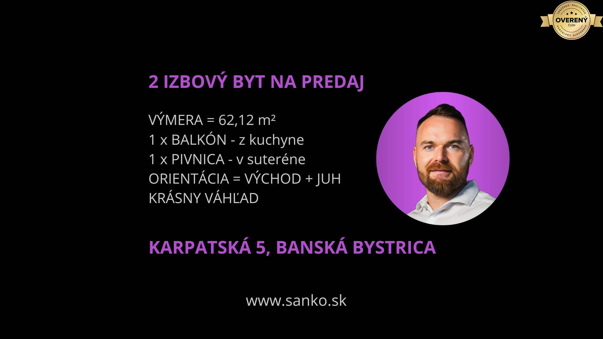 Na predaj 2-izbový byt typu „U“ na ulici Karpatská 5 v Banskej Bystrici, vo veľmi dobrej lokalite v rámci Sásovej. Byt ponúka tiché bývanie, dostatok svetla, krásny výhľad a výbornú občiansku vybavenosť.