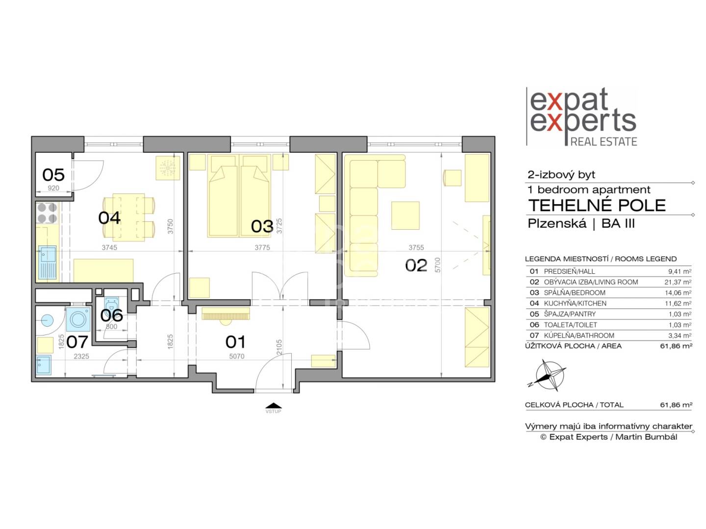 celková rozloha 61,86 m2 + pivnica 1,5 m2; situovaný na 5.poschodí (6) v bytovom dome s výťahom;