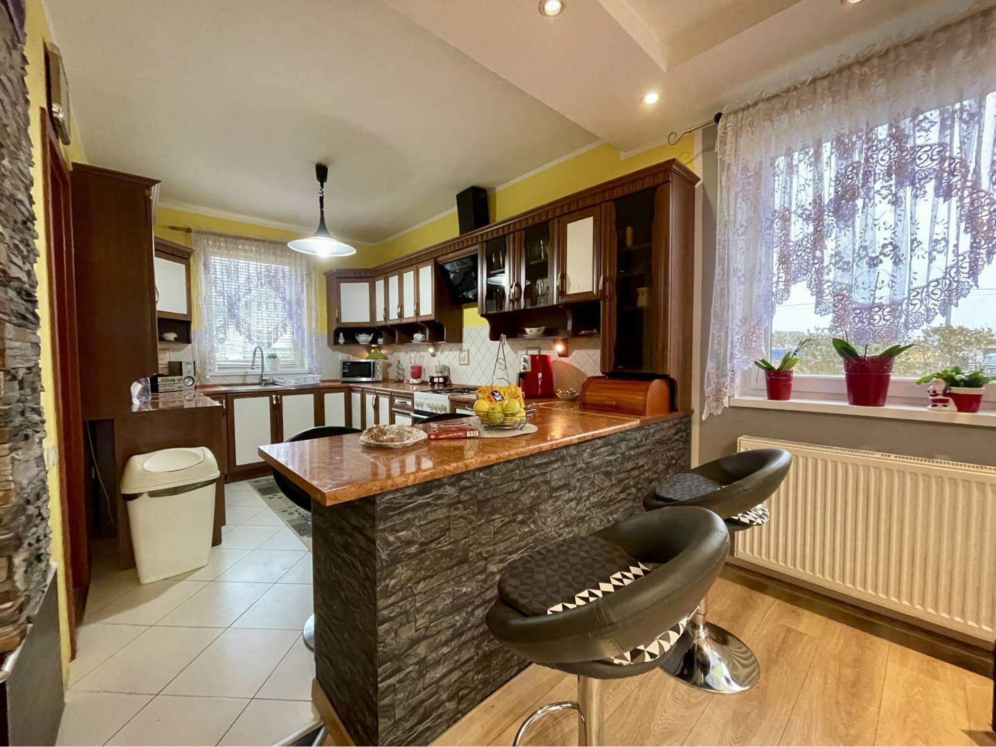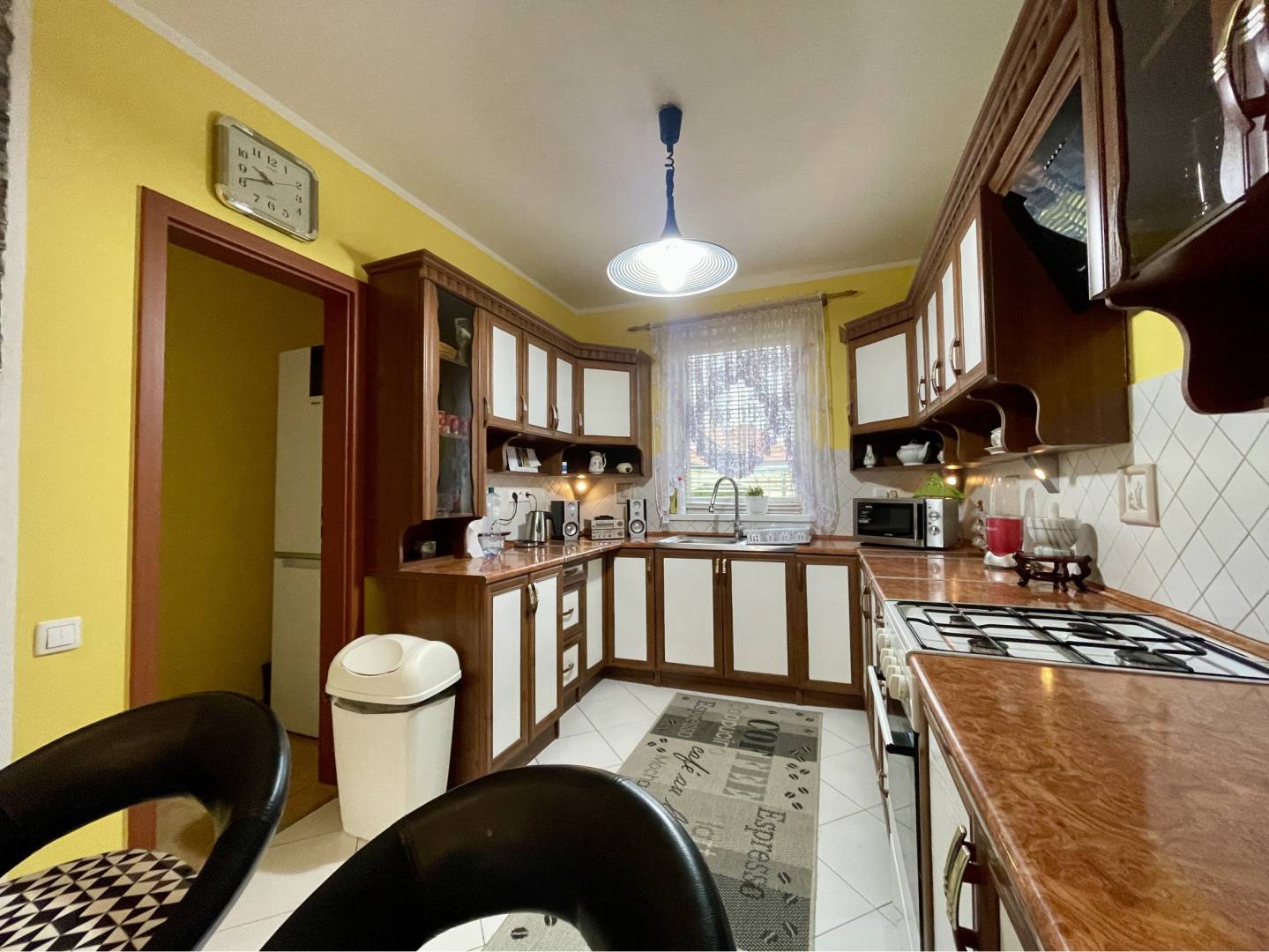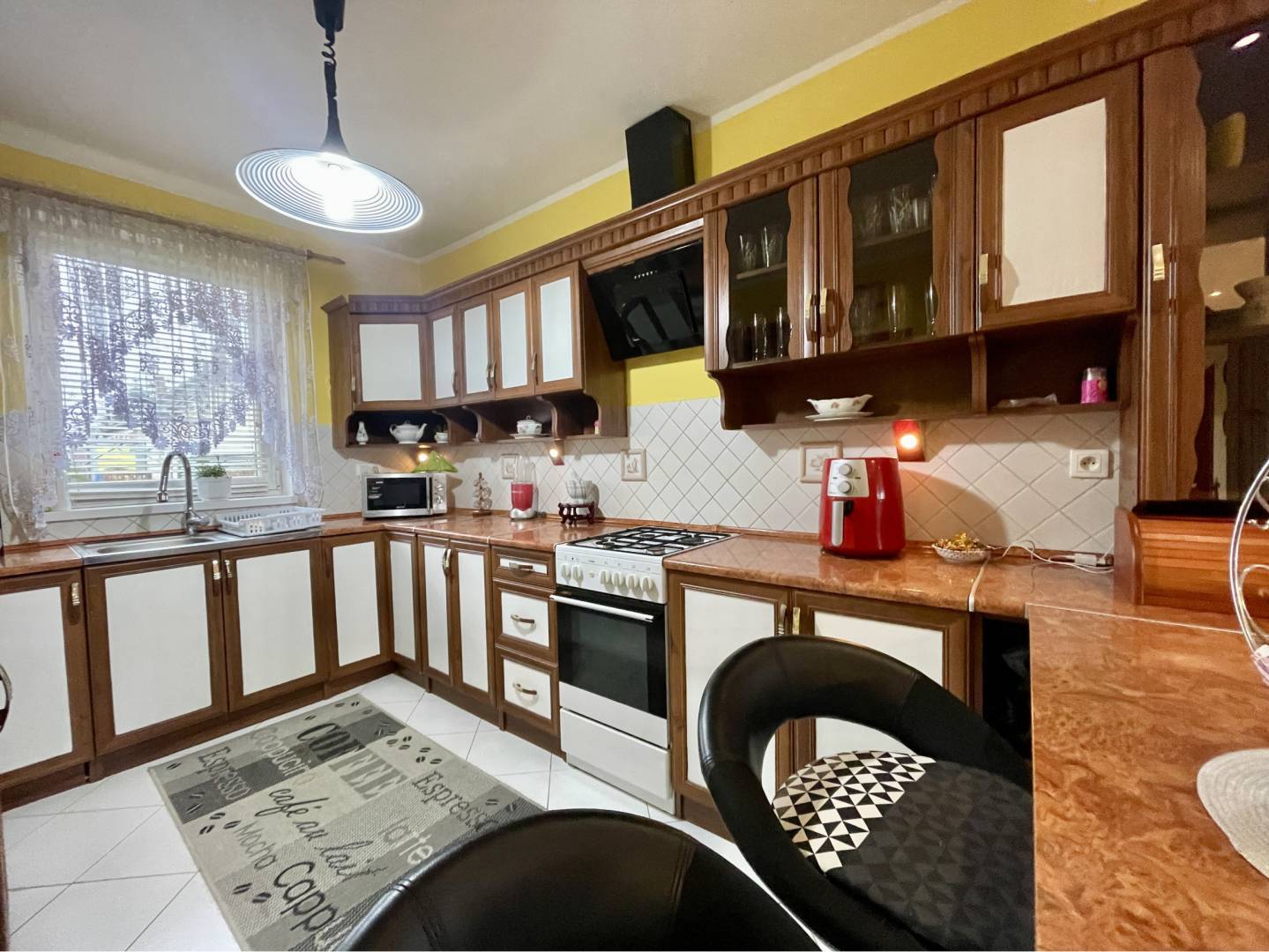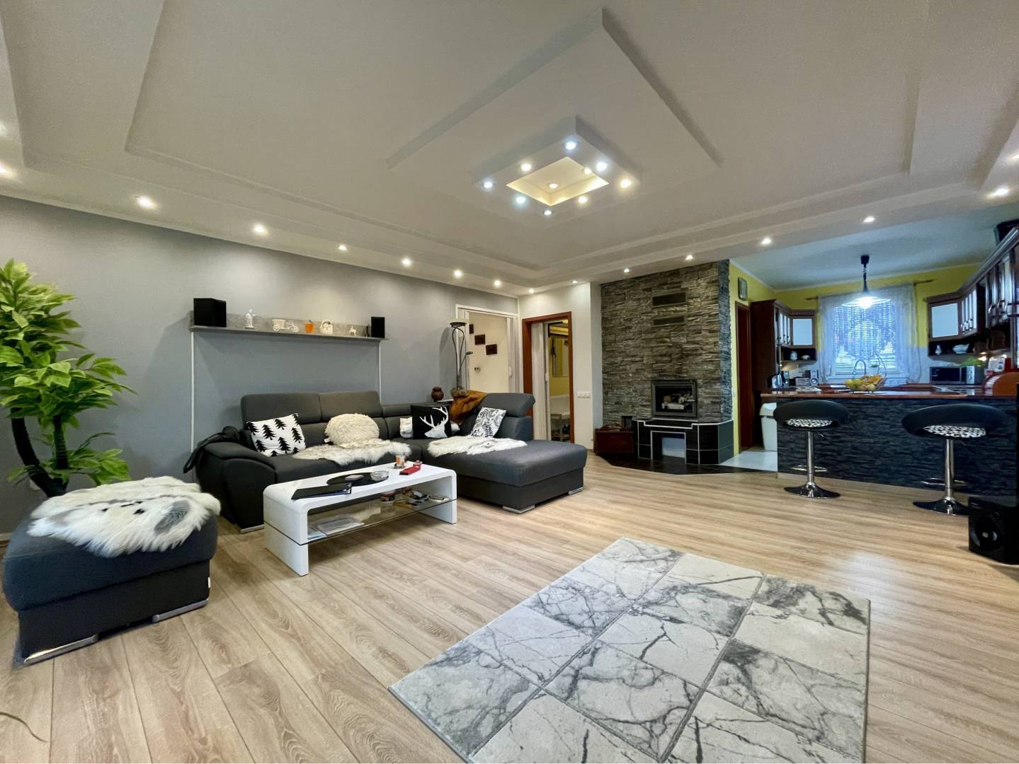Po vstupe do domu sa dostaneme do predsiene so vstavanou skriňou. Odtiaľ je vchod do obývačky s krbom, alebo do záchodu pre hostí. Obývačka je spolu s kuchyňou s špajzou. V kuchyni sa nachádza vkusná kuchynská linka. Z obývačky je vstup na terasu, alebo na chodbu, odkiaľ je vchod do ostatných miestnostiach, ako kúpeľňa a 3 izby. V dvoch izbách sa nachádza aj vstavaná skriňa. V kúpeľni je vaňa, sprchový kút a záchod. Na podlahe v obytných častiach je plávajúca podlaha a v ostatných miestnostiach je dlažba. Vedľa terasy je bazén, na dvore je tráva a sú tuje.