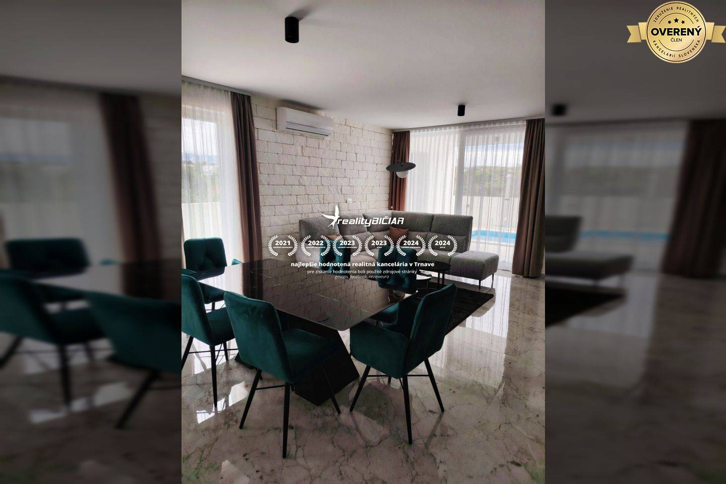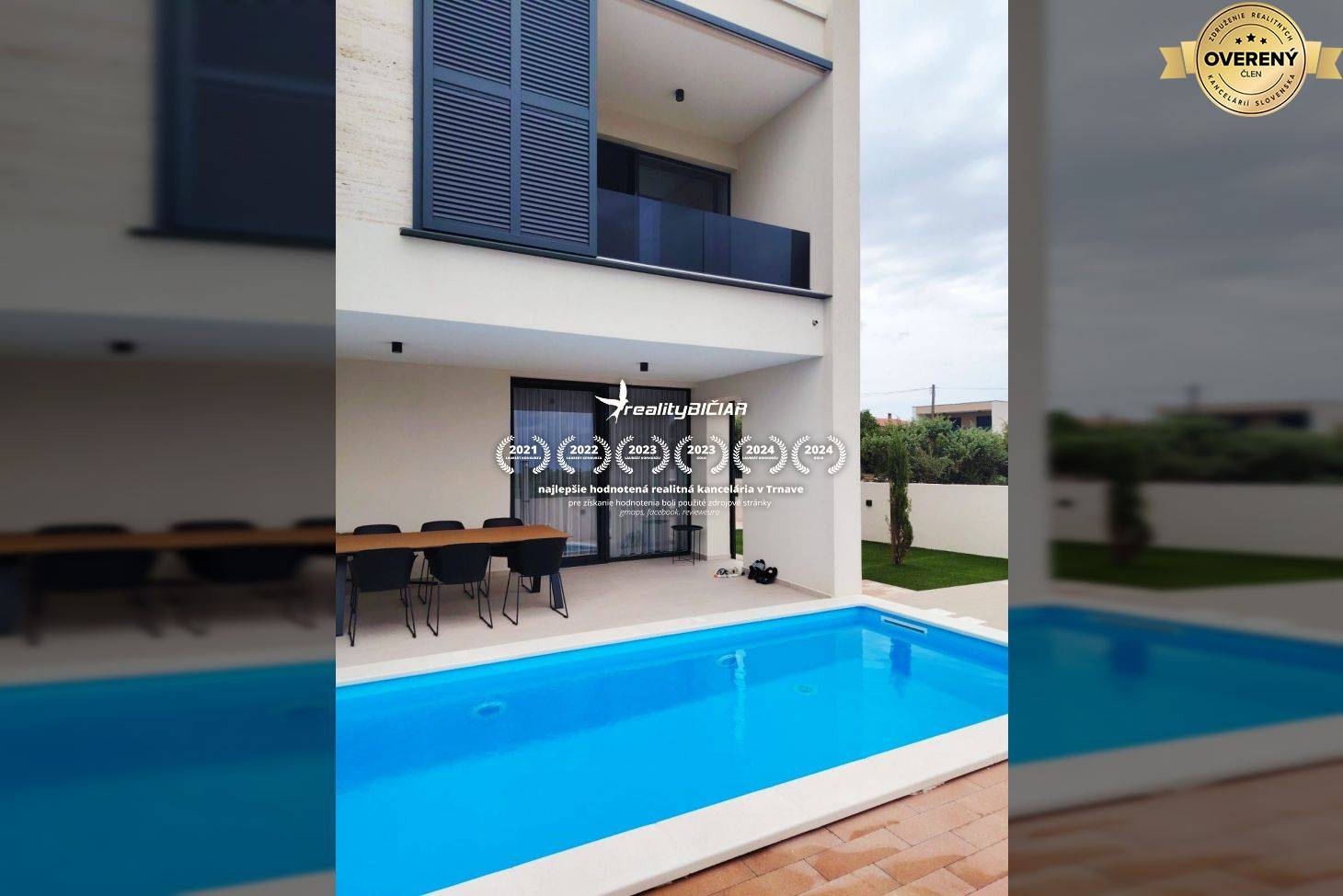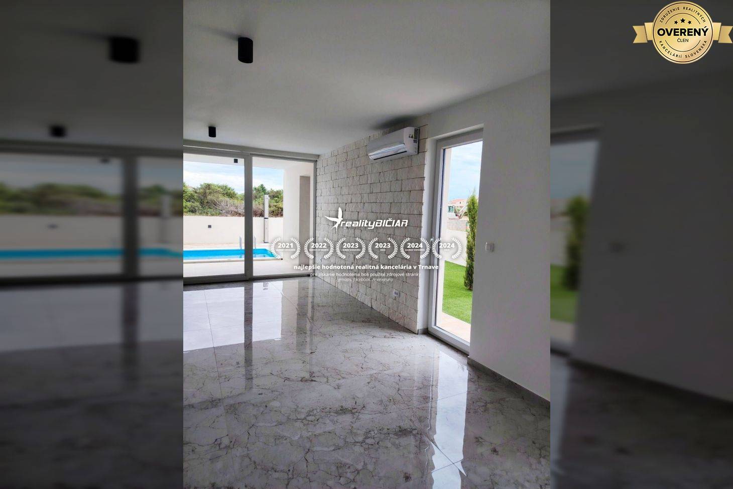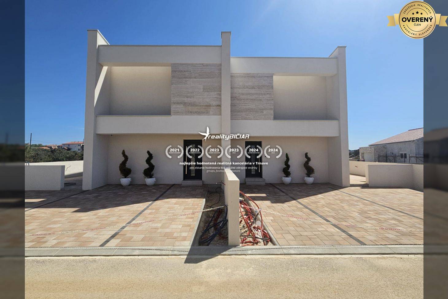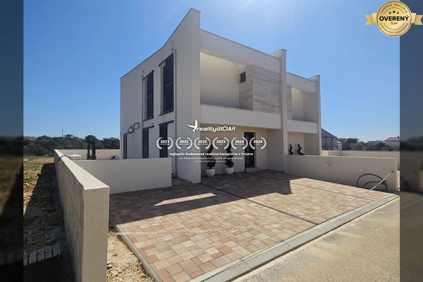 Predávaný dvojdom s bazénom je zasadený práve do tejto pokojnej časti Vrsi/Mulo, čo umocňuje súkromie dvora s priestorom na opaľovanie a terás. Denná zóna v prízemí (vstupná hala so schodiskom, kuchyňa s jedálňou, priestranná obývačka a toaleta) plynule komunikuje s exteriérom, kým horné poschodie poskytuje tri spálne, dve kúpeľne a terasu pre nerušený odpočinok. Praktickým prvkom sú aj 2 parkovacie miesta na pozemku.