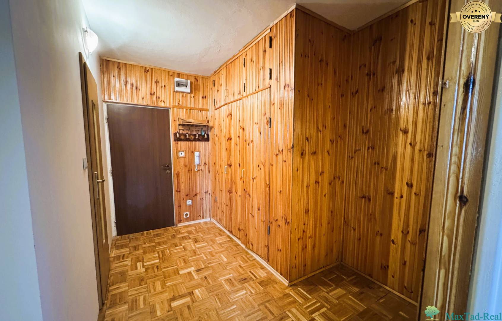 K dispozícii je aj priestranná vstupná chodba s veľkým úložným priestorom, ktorá vďaka drevenému obkladu vytvára útulný a praktický vstup do bytu – ideálne na odkladanie odevov, športových vecí či vybavenia domácnosti.