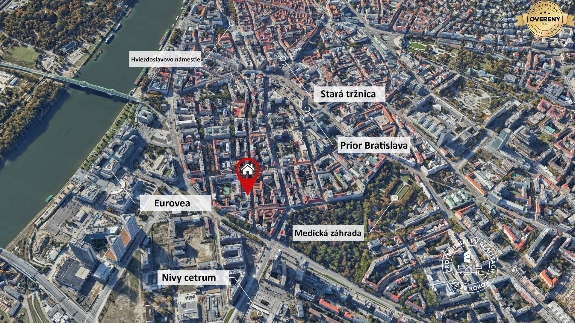 Komplexnosť lokality podčiarkujú blízke centrá Nivy a Eurovea, obchodný dom Prior s Tescom a neďaleké potraviny Lidl a Yeme. V okolí funguje fitness centrum so squashovými kurtmi a lezeckou stenou a na Dunajskej ulici nájdete aj Meštiansky pivovar. Silná vybavenosť, parky a centrálna poloha tak vytvárajú dobré zázemie pre bývanie aj investičný prenájom, najmä ak uvažujete o praktickom využití dvoch samostatných 2-izbových jednotiek v rámci jedného 4-izbového bytu.