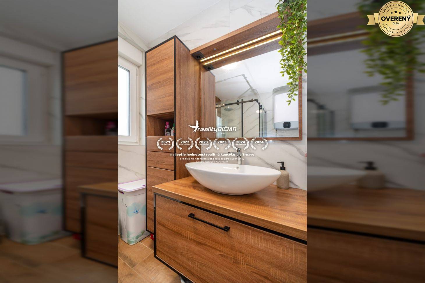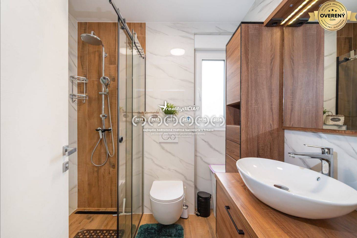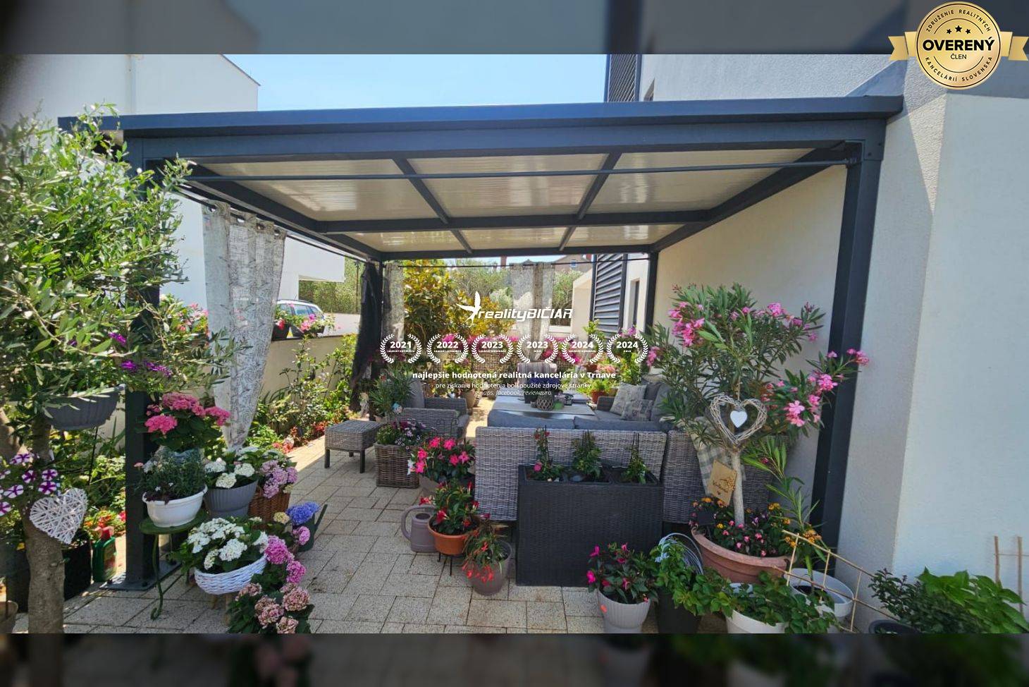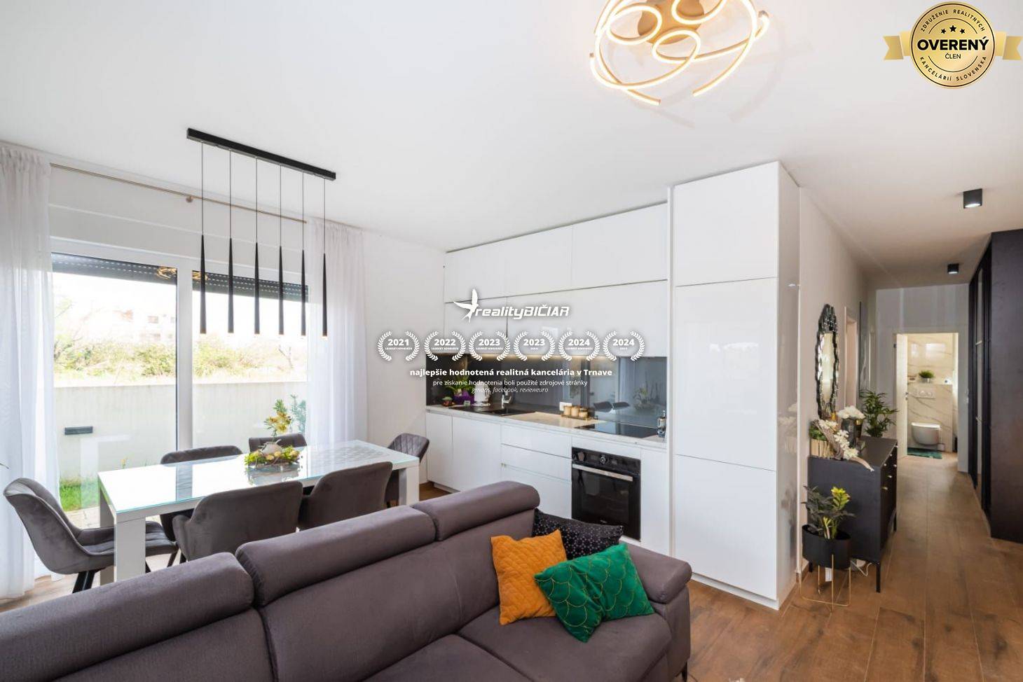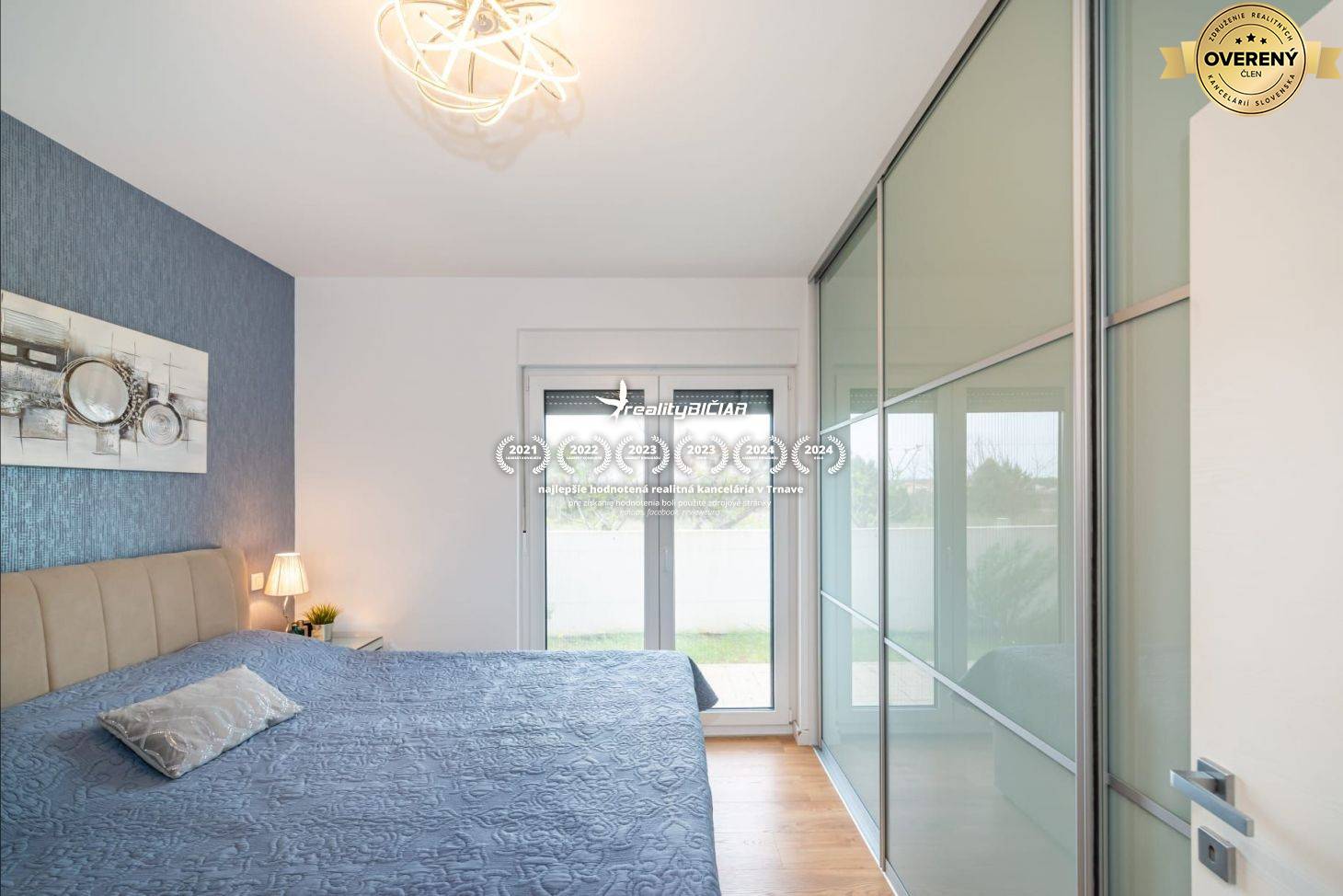 Byt pozostáva z chodby, obývačky, kuchyne, kúpeľne a dvoch spální s úžitkovou plochou 56,53 m2 a krytej terasy o výmere 8,90 m2. K bytu patrí aj vonkajšie kryté parkovacie miesto, terasa o výmere 9,87 m2 a záhrada o výmere 96,48 m2. Celková úžitková plocha bytu je 184,28 m2.