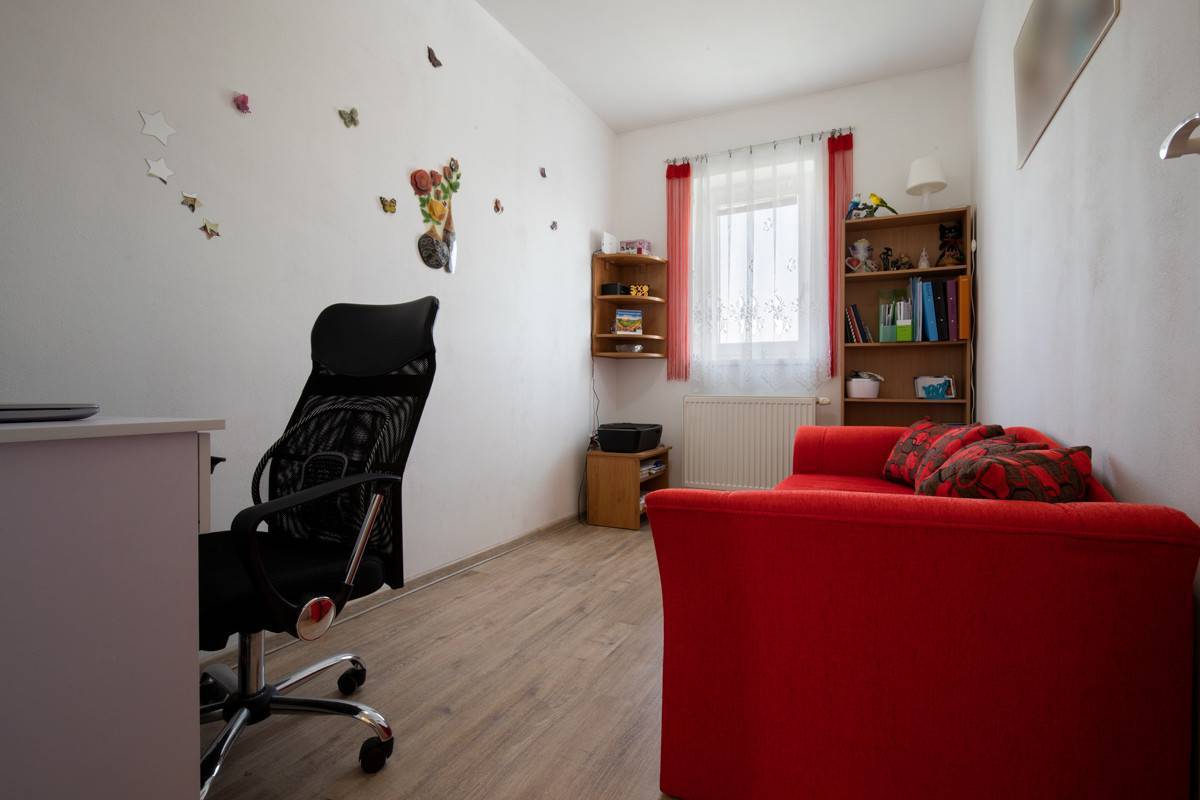 Poschodie: odkladací priestor,gardrób, kúpeľka s toaletou a s vaňou, spáľňa,detská izba,vchod na povalu.