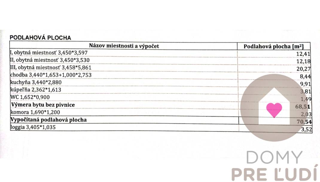 Celková výmera bytu je 74,25 m2 z čoho byt má 68,7 m², balkón: 3,52 m² a pivnica, ktorá sa nachádza na chodbe pri byte má výmeru 2,03 m².